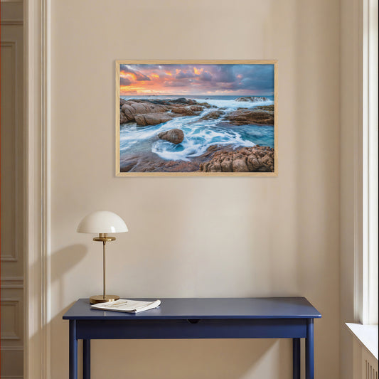 His style balances chaos with calm. Nature and people sit at the centre of his work, particularly the ocean and the character of everyday Australians. He embraces inconsistency as part of his process, allowing each piece to respond honestly to mood and environment, reflecting the real contrasts of life in Australia.