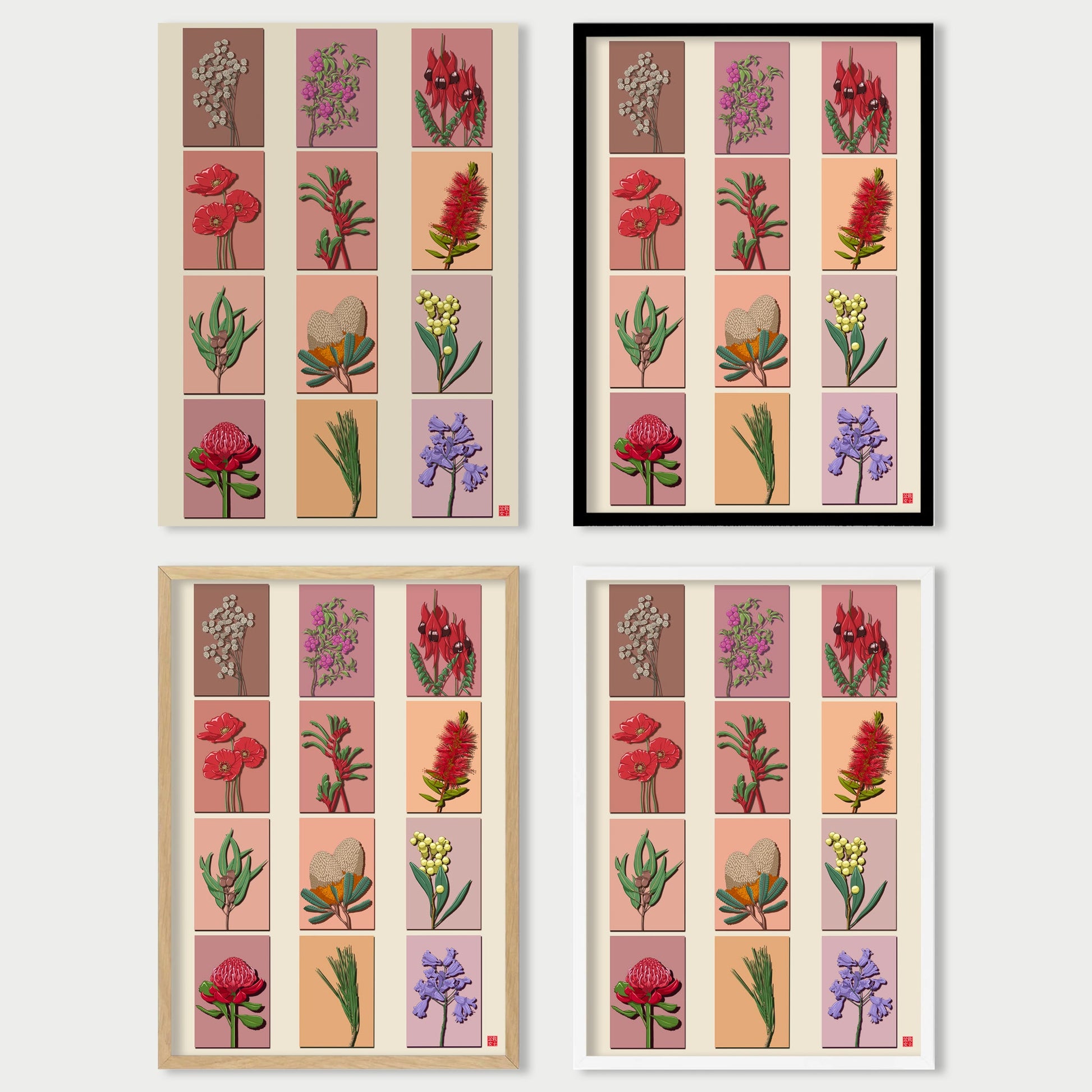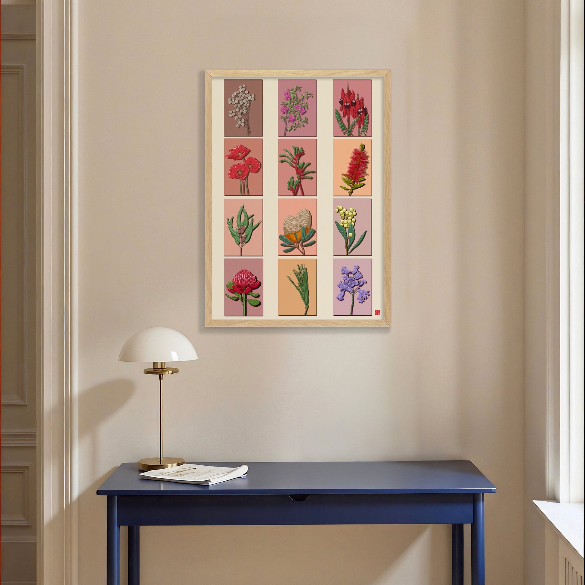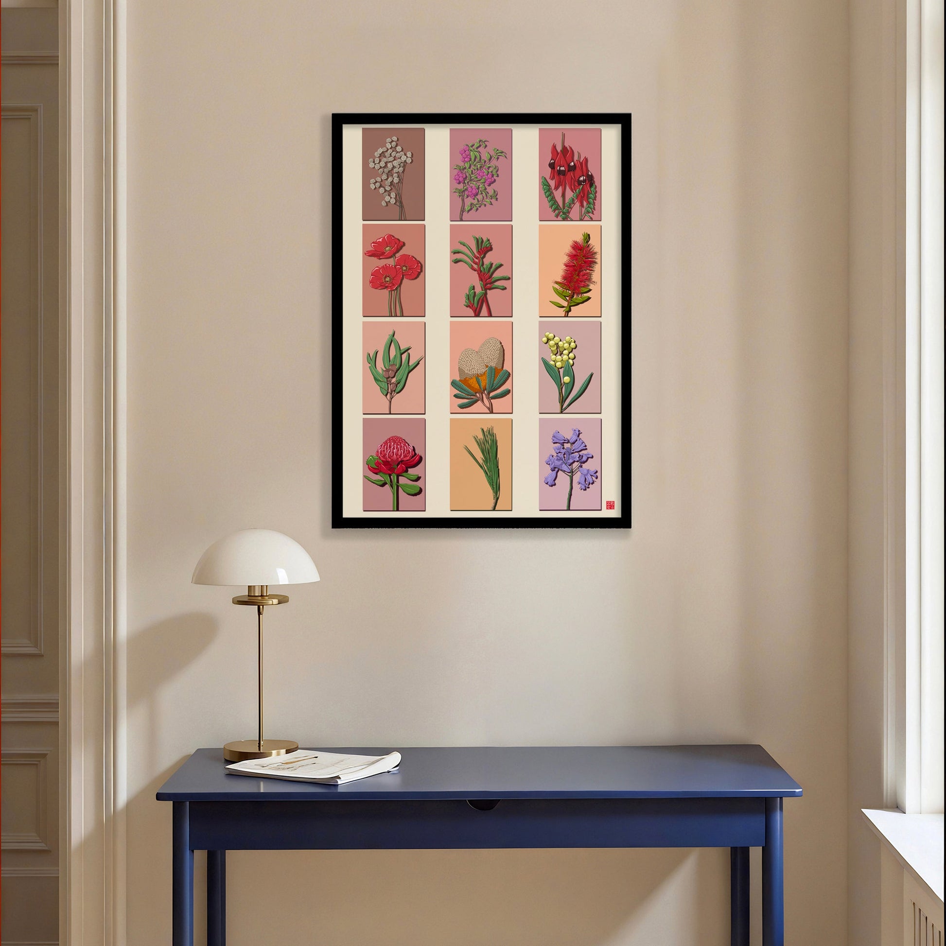 Fine art print created by Sam Leahy features an array of Australian native plants that flower throughout the year.