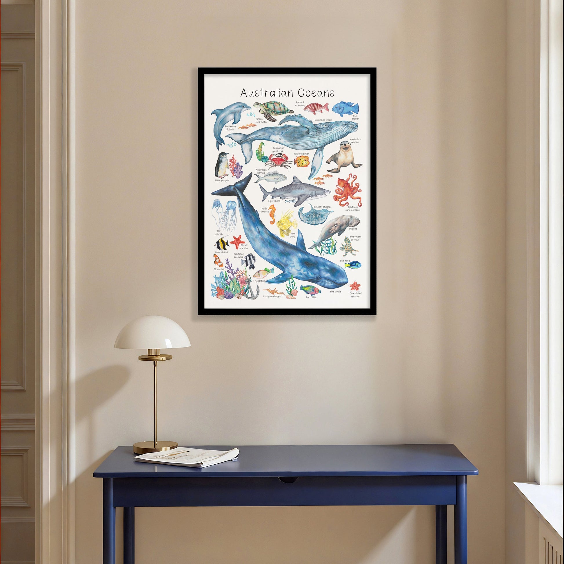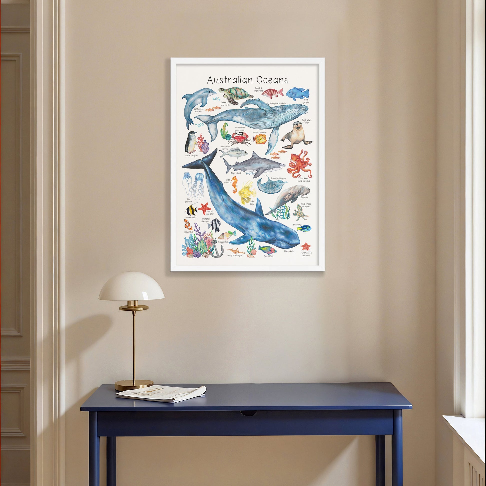 Fine art print created by Abbi McClure playfully explores the animals found in Australia's deep blue with this series of hand-drawn illustrations. Perfect for educating little ones about their favourite Australian animals in a playful and artistic way.