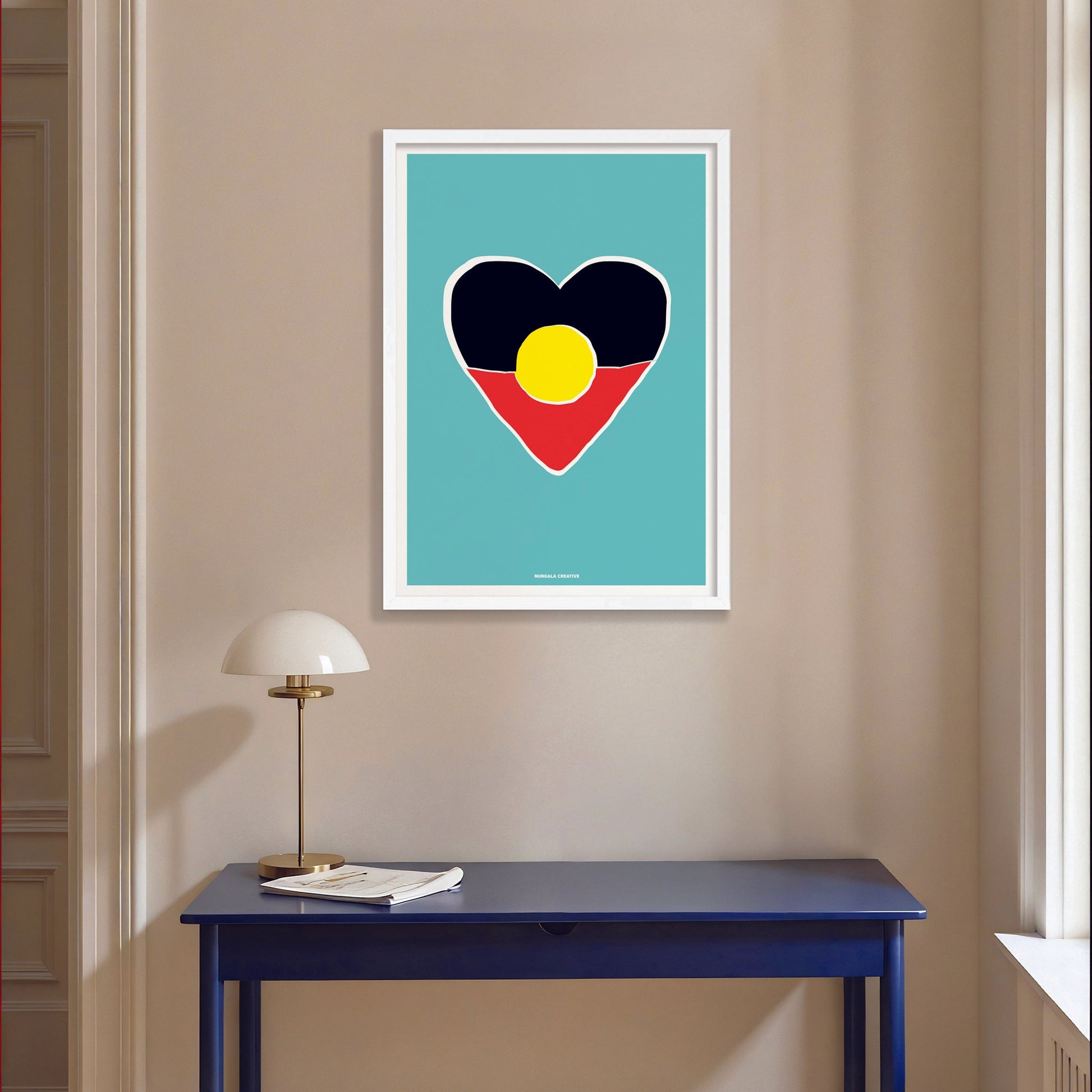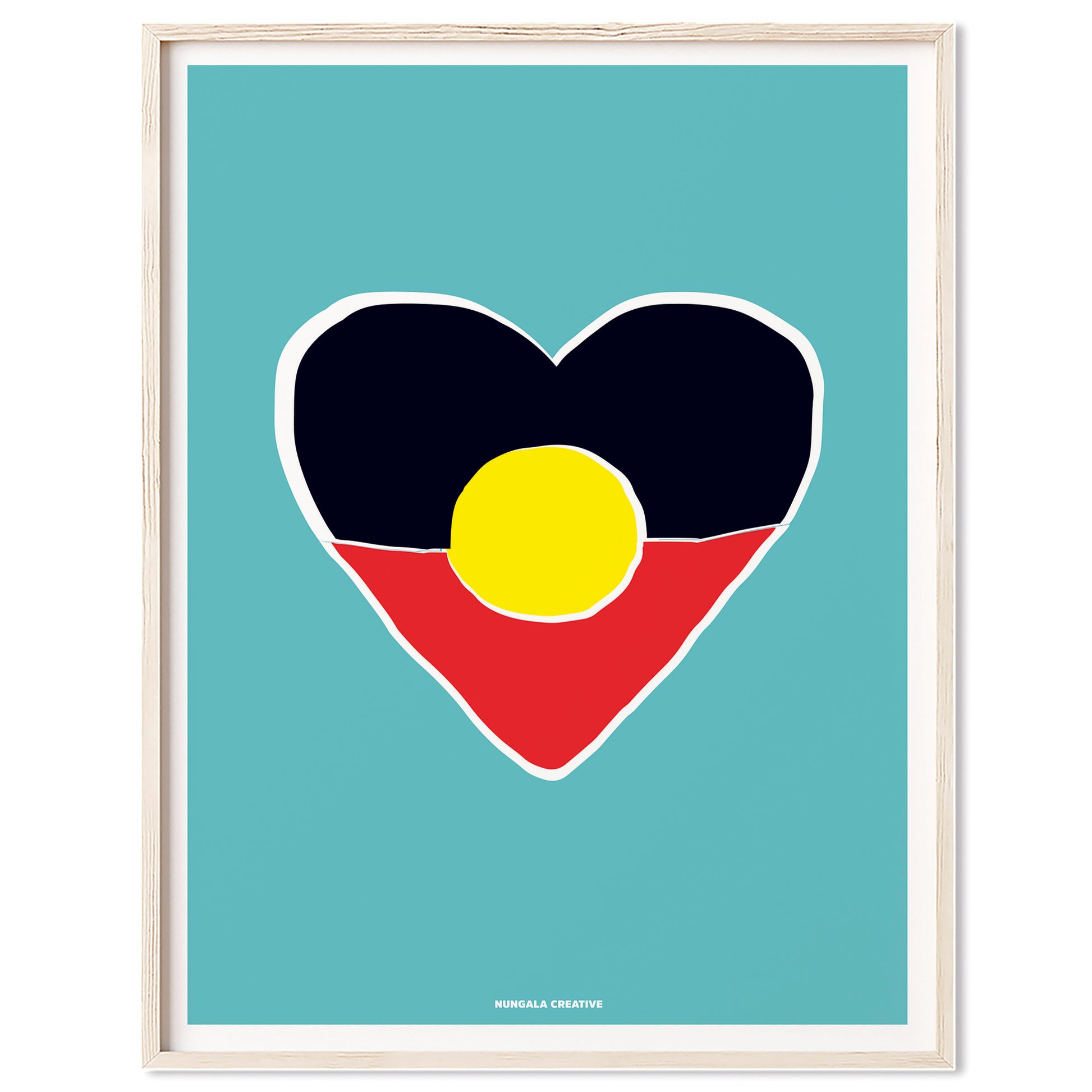 Art poster created by Ngunnawal country (Canberra) artist Jessica Johnson with the three Aboriginal flag colours in the shape of a love heart.