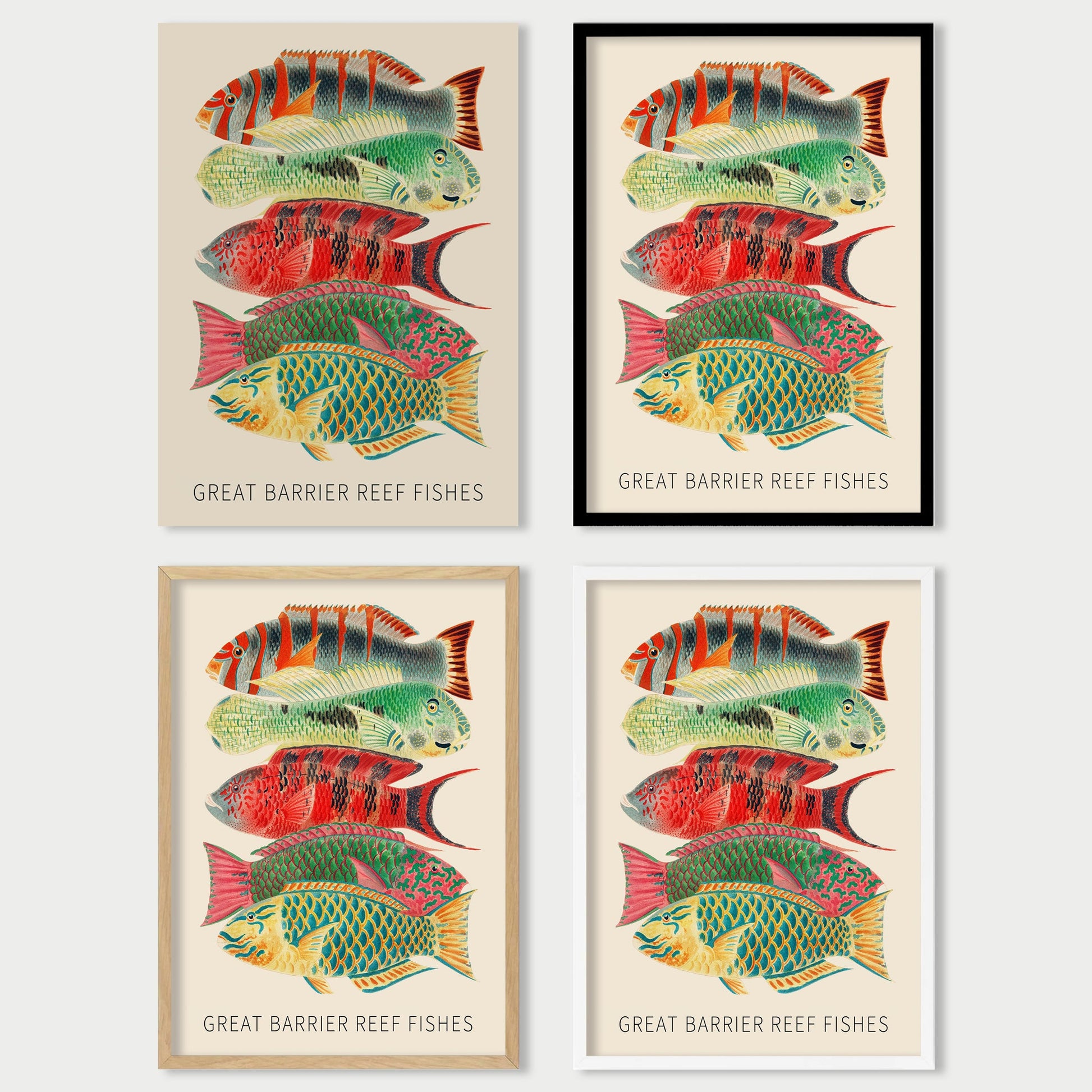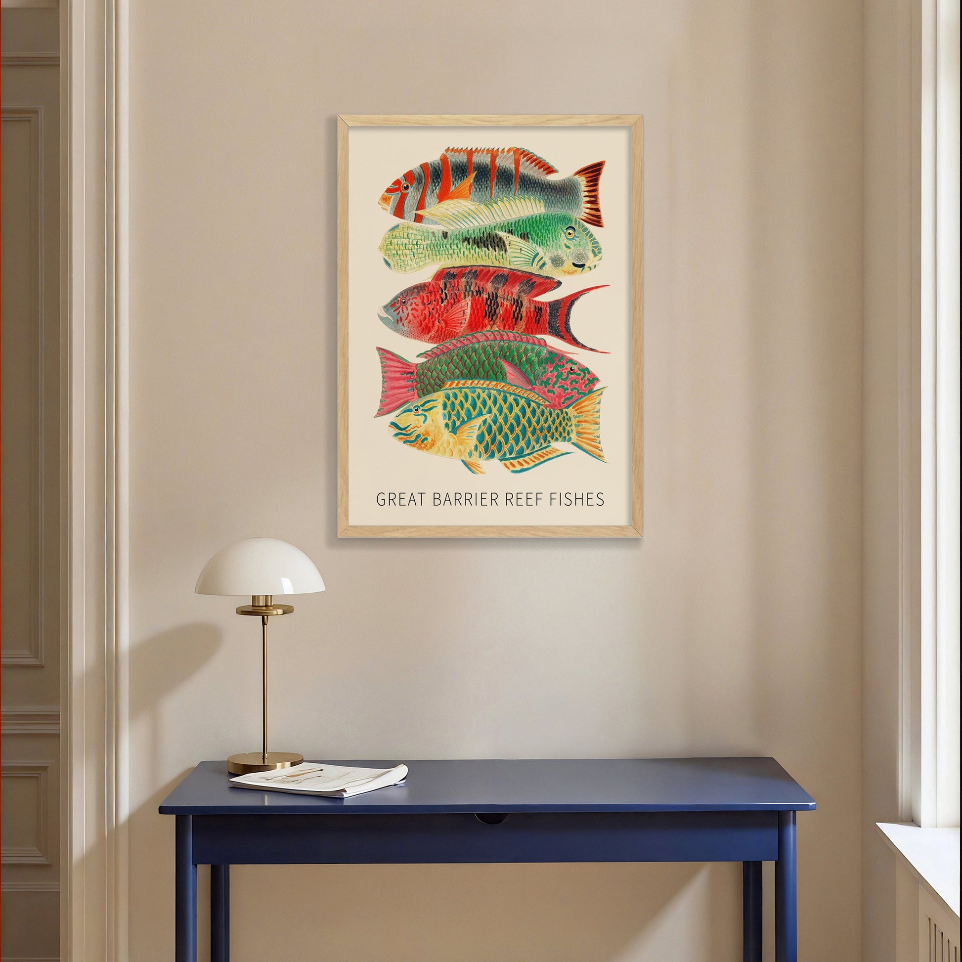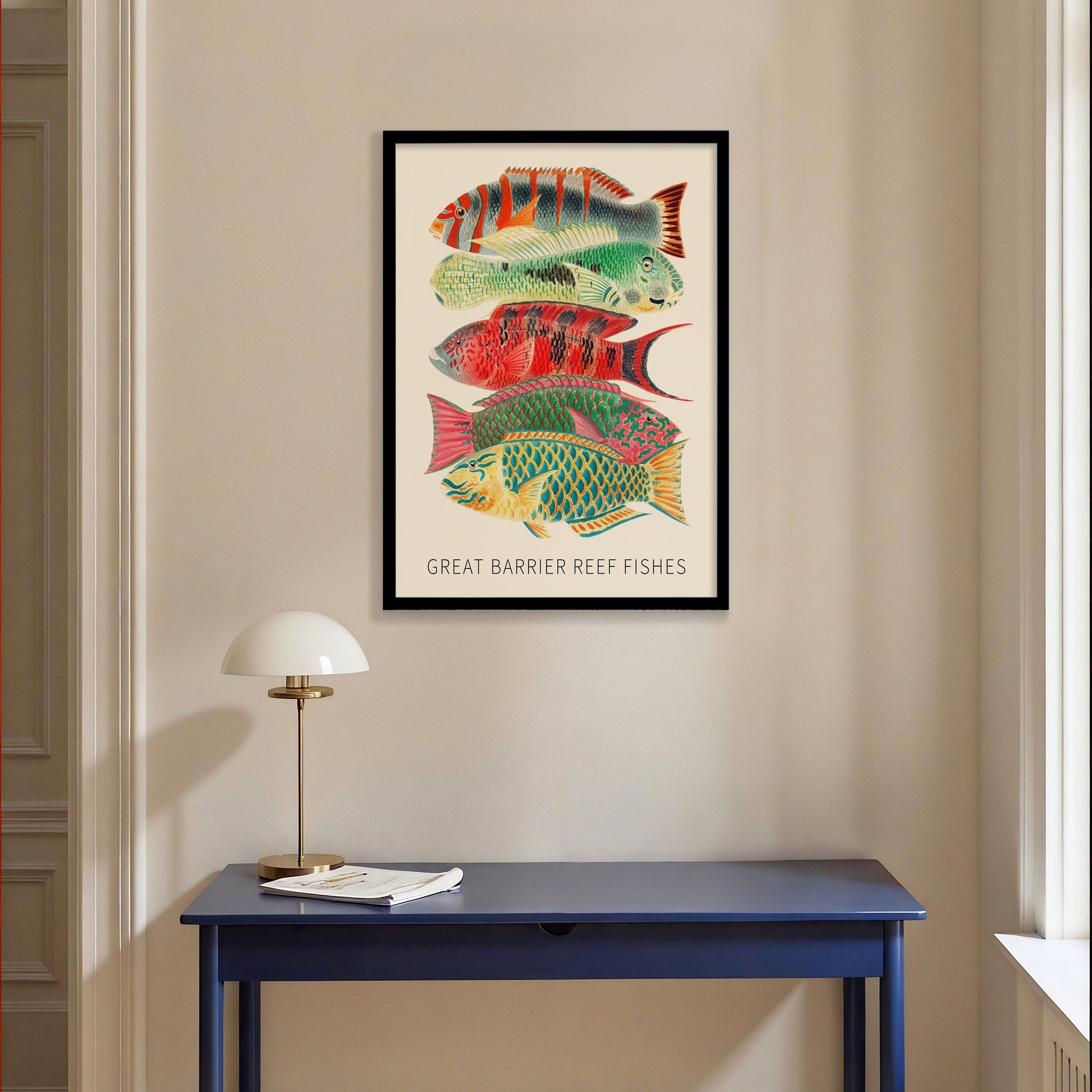 Art print by Posteroo celebrates the bright tropical fishes found across the Australian Great Barrier Reef. This print brings a touch of vintage Australia to your home.