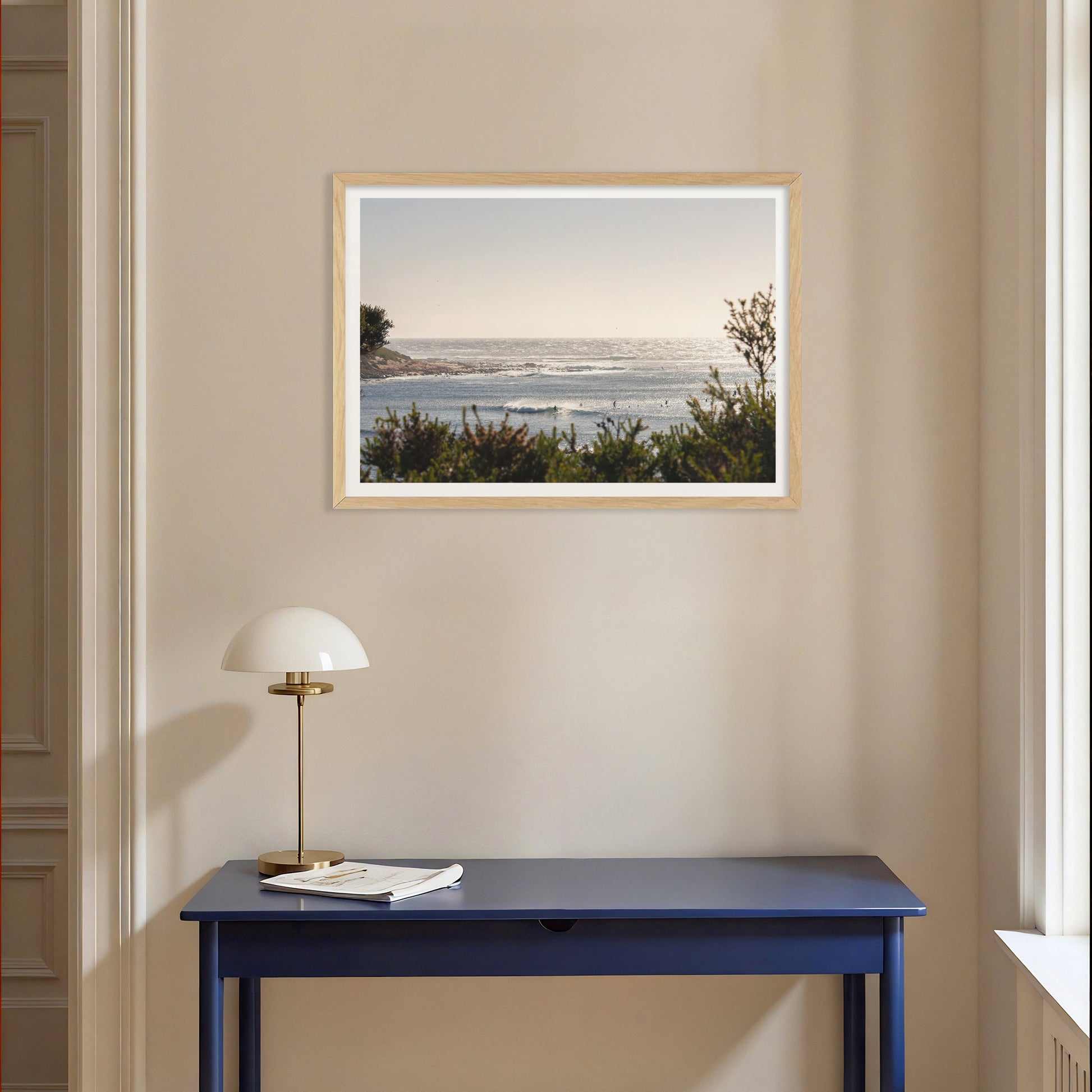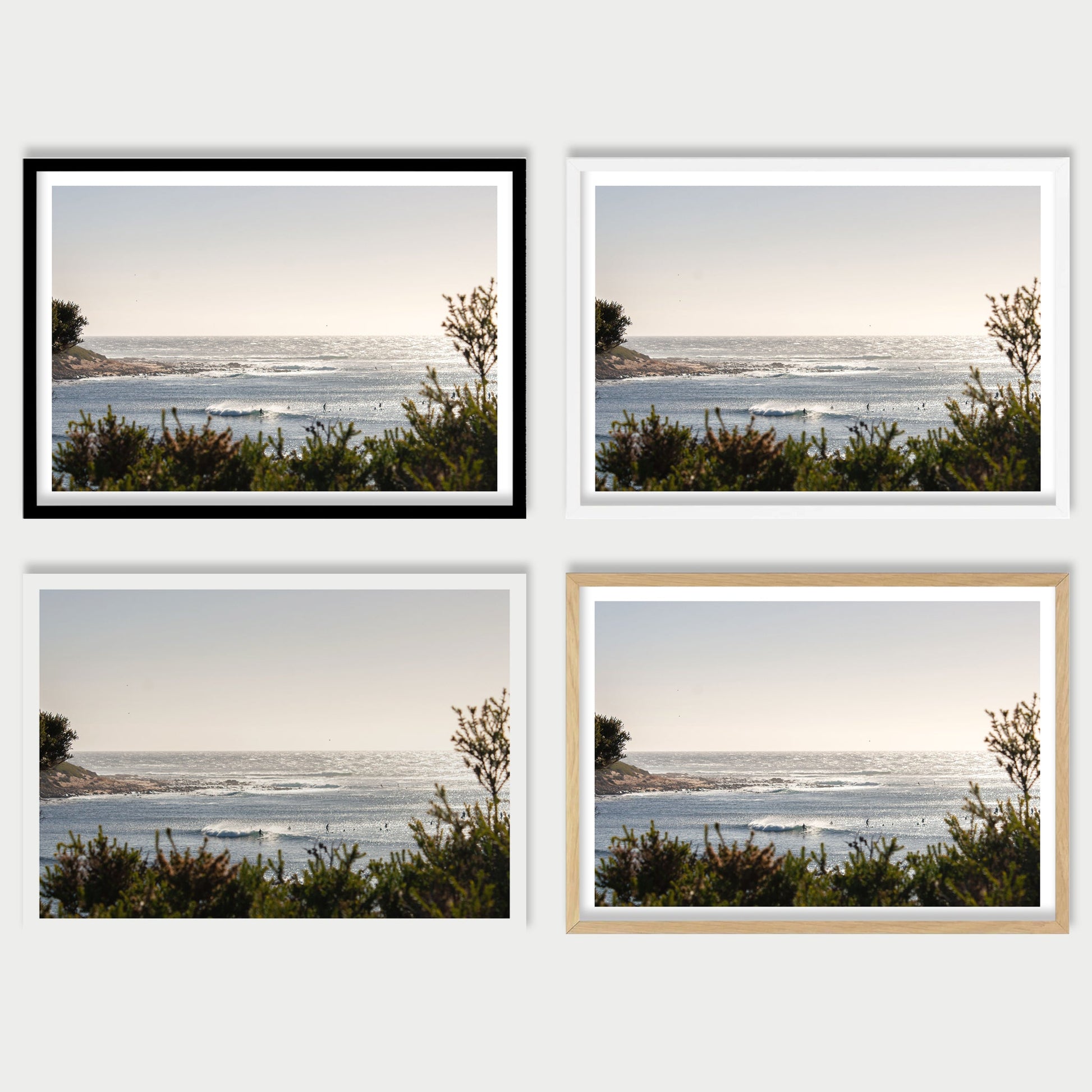 Handcrafted wooden frames available in Black, Natural Oak, or White.