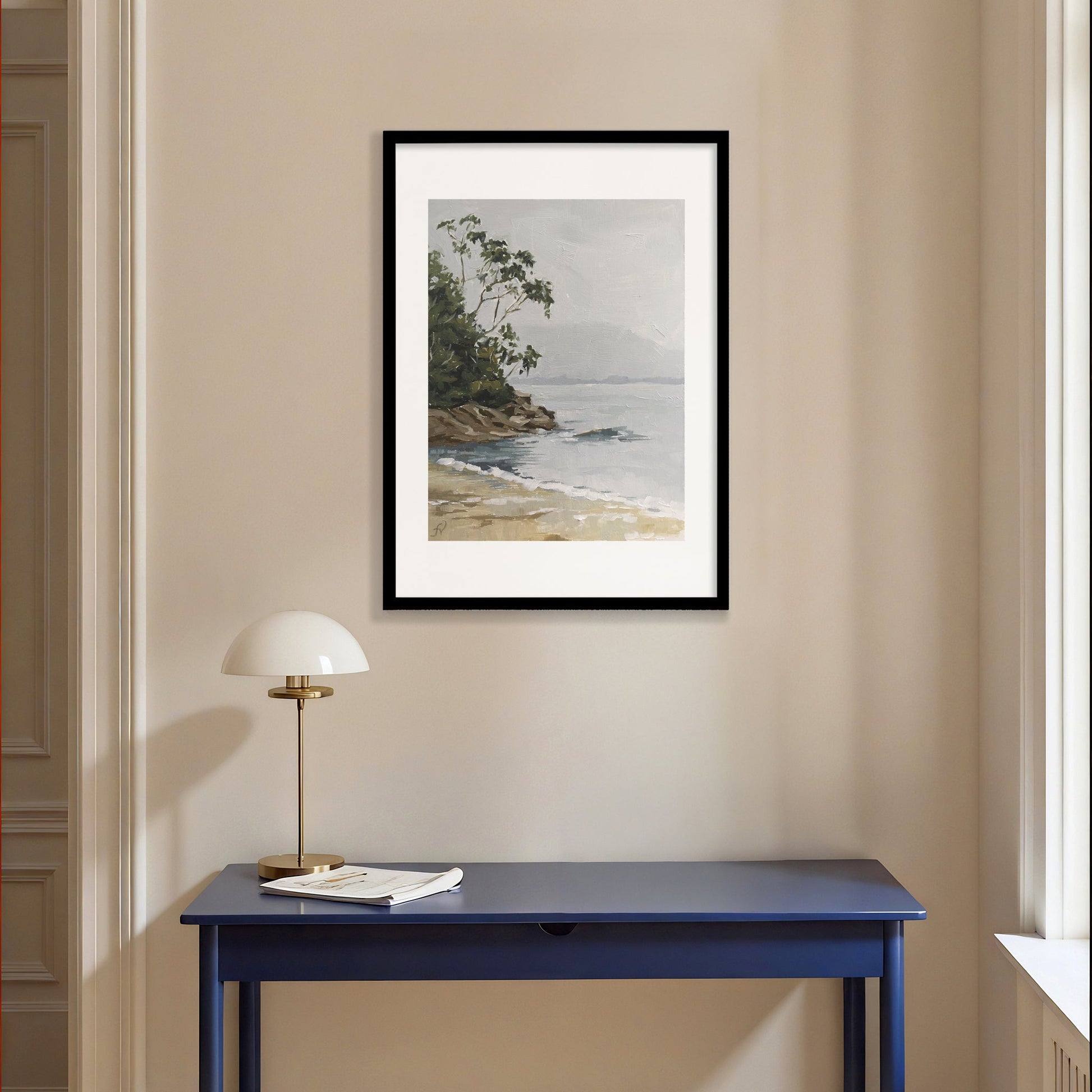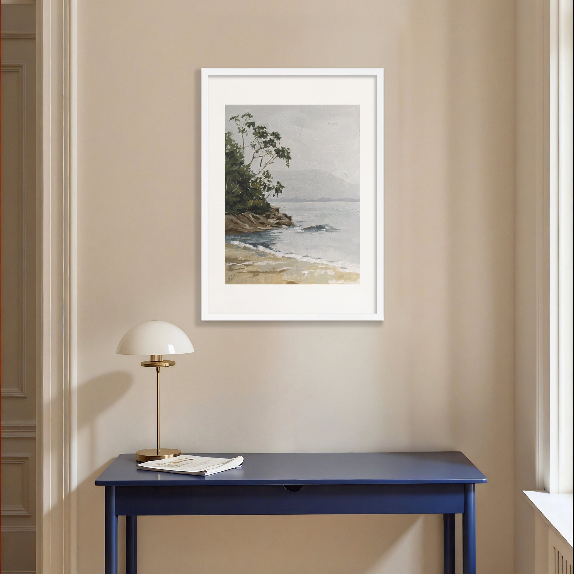 Oil painting print created by Fiona Verdouw exploring the beauty of moody grey days at Surveyors Bay, Tasmanian.