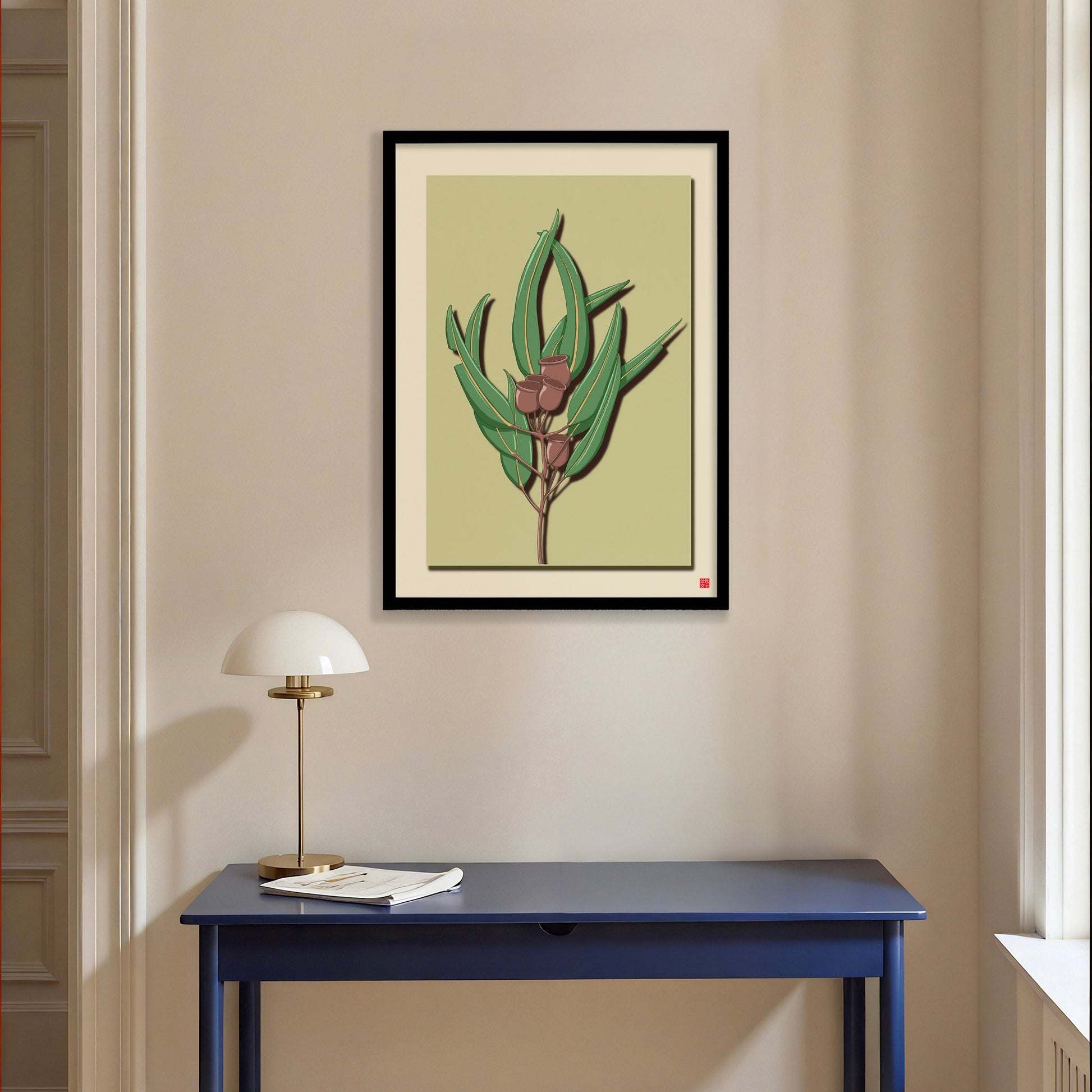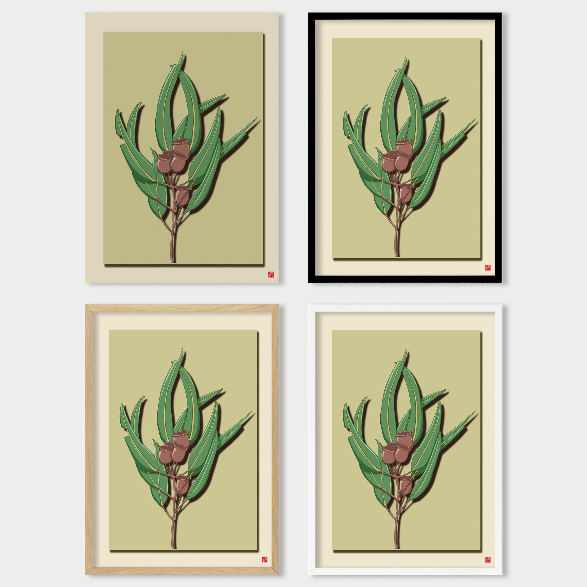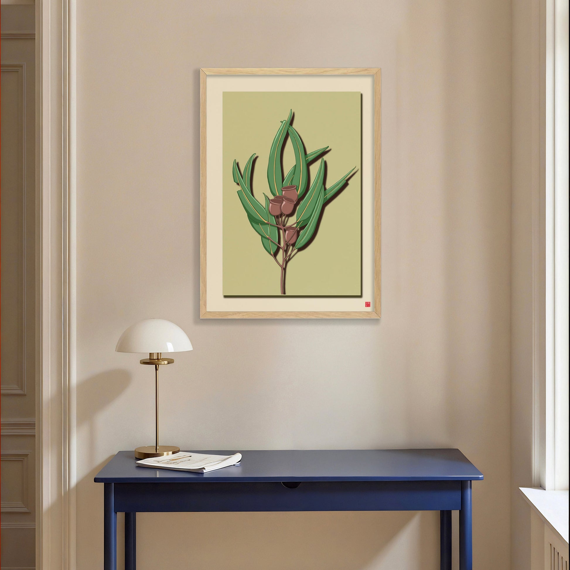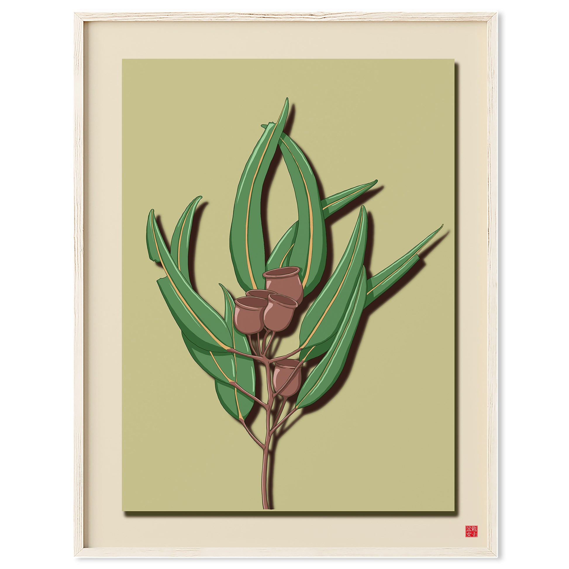 This fine art print by Sam Leahy shows a group of gumnuts hanging from a Eucalyptus tree.