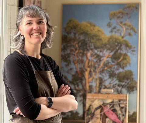 Her representational landscapes are inspired not by iconic landmarks, but by the quiet beauty found in everyday moments in nature—bush tracks, eucalyptus trees, shifting light, and the distinctive textures and colours of the Australian wilderness.