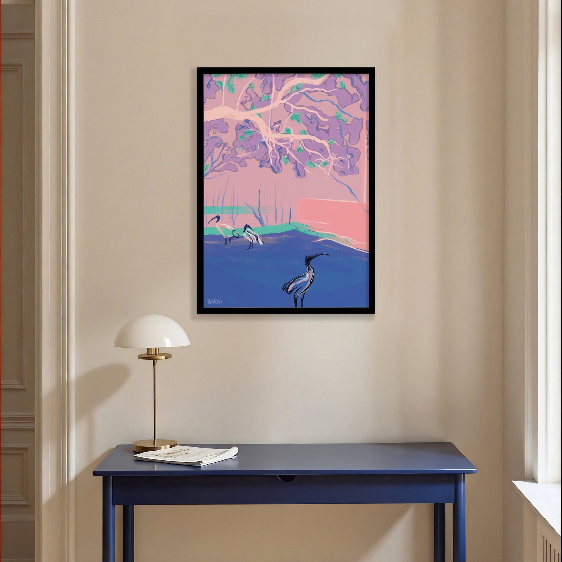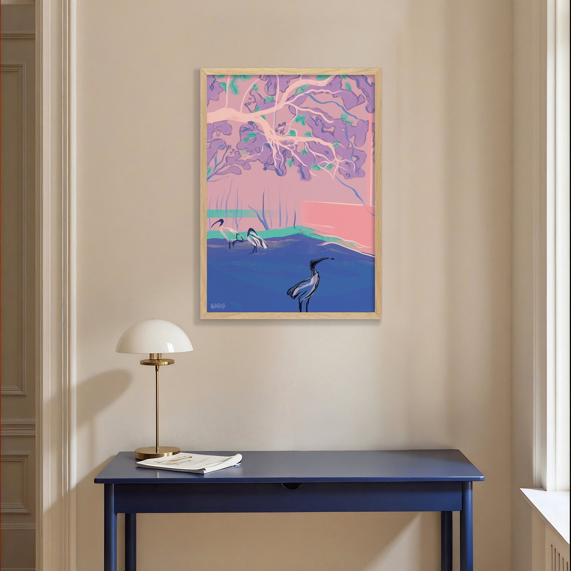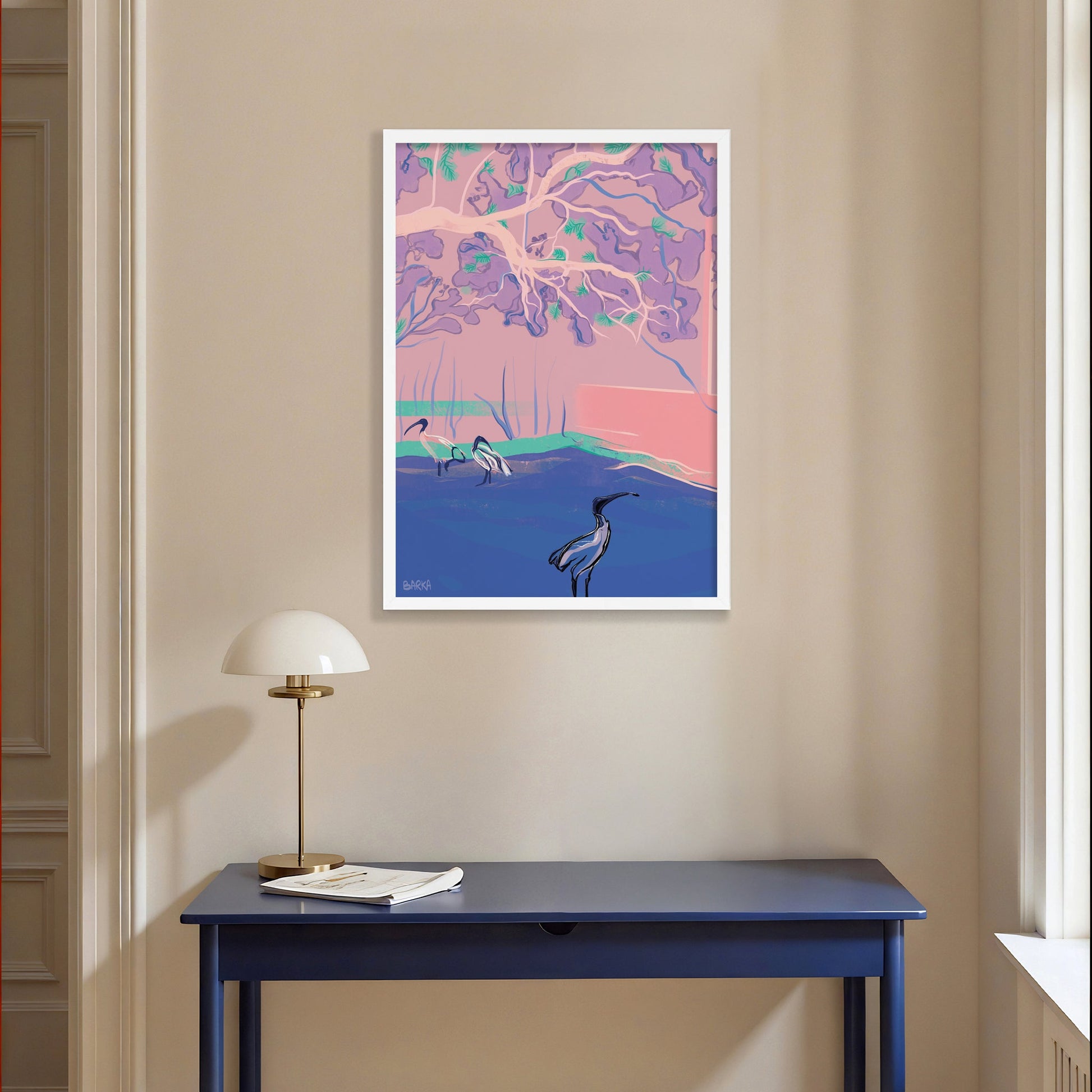 Discover wonderful pastel-coloured landscapes through the eyes of Sydney and French based designer Barka. This fine art print by Barka captures the iconic Australia White Ibis bird foraging under a jacaranda tree.