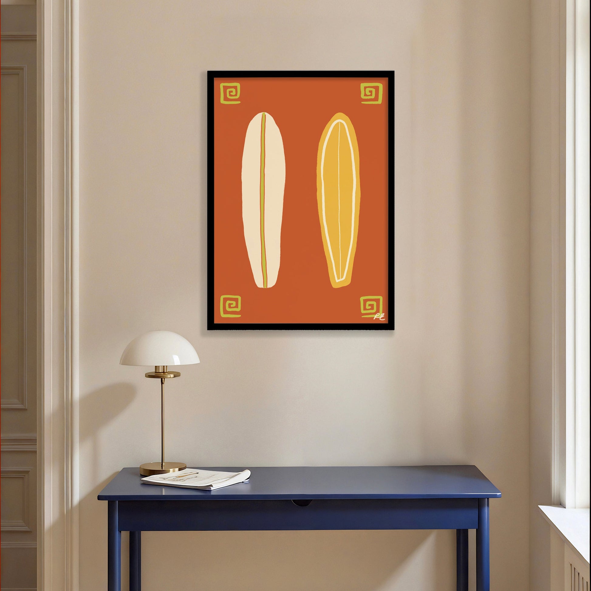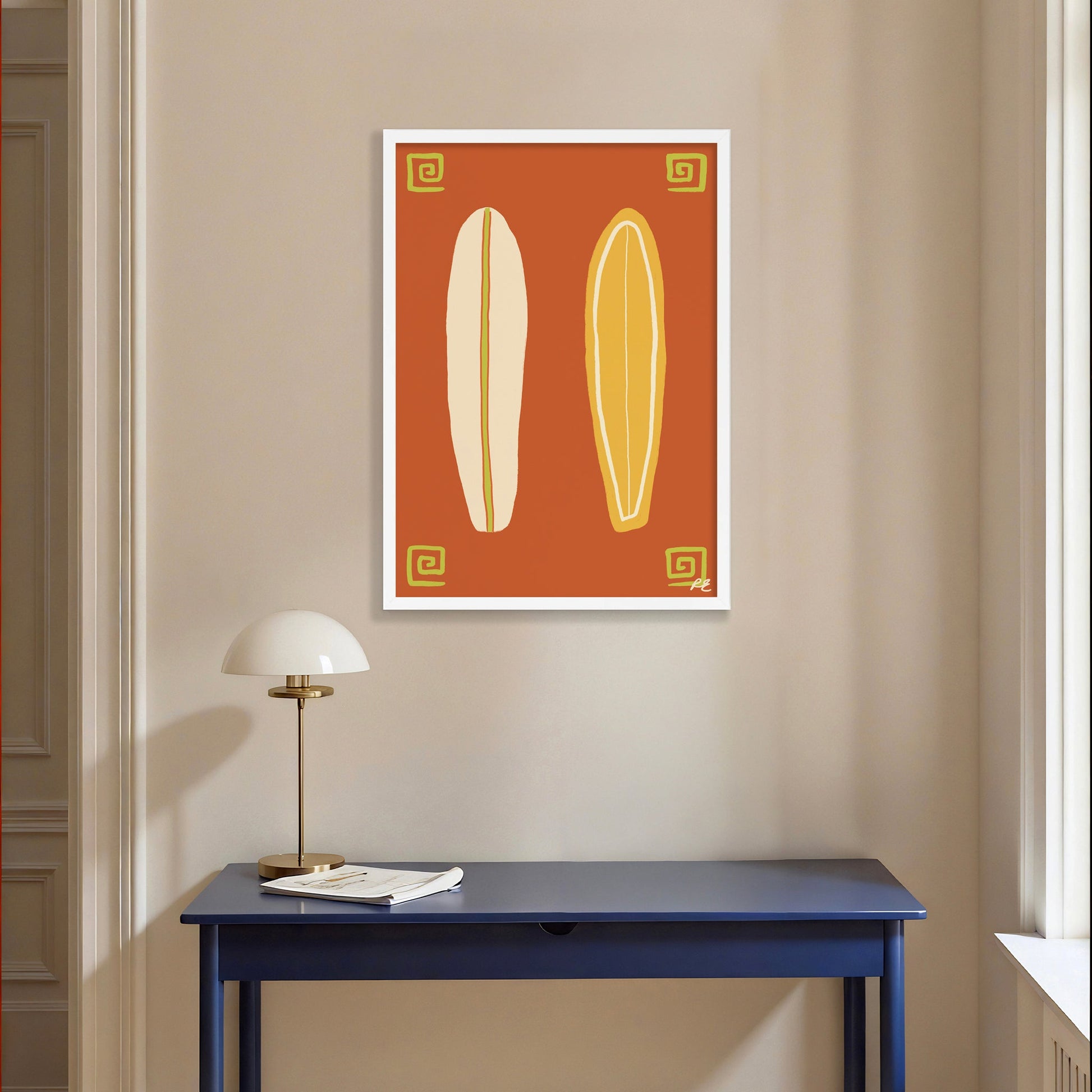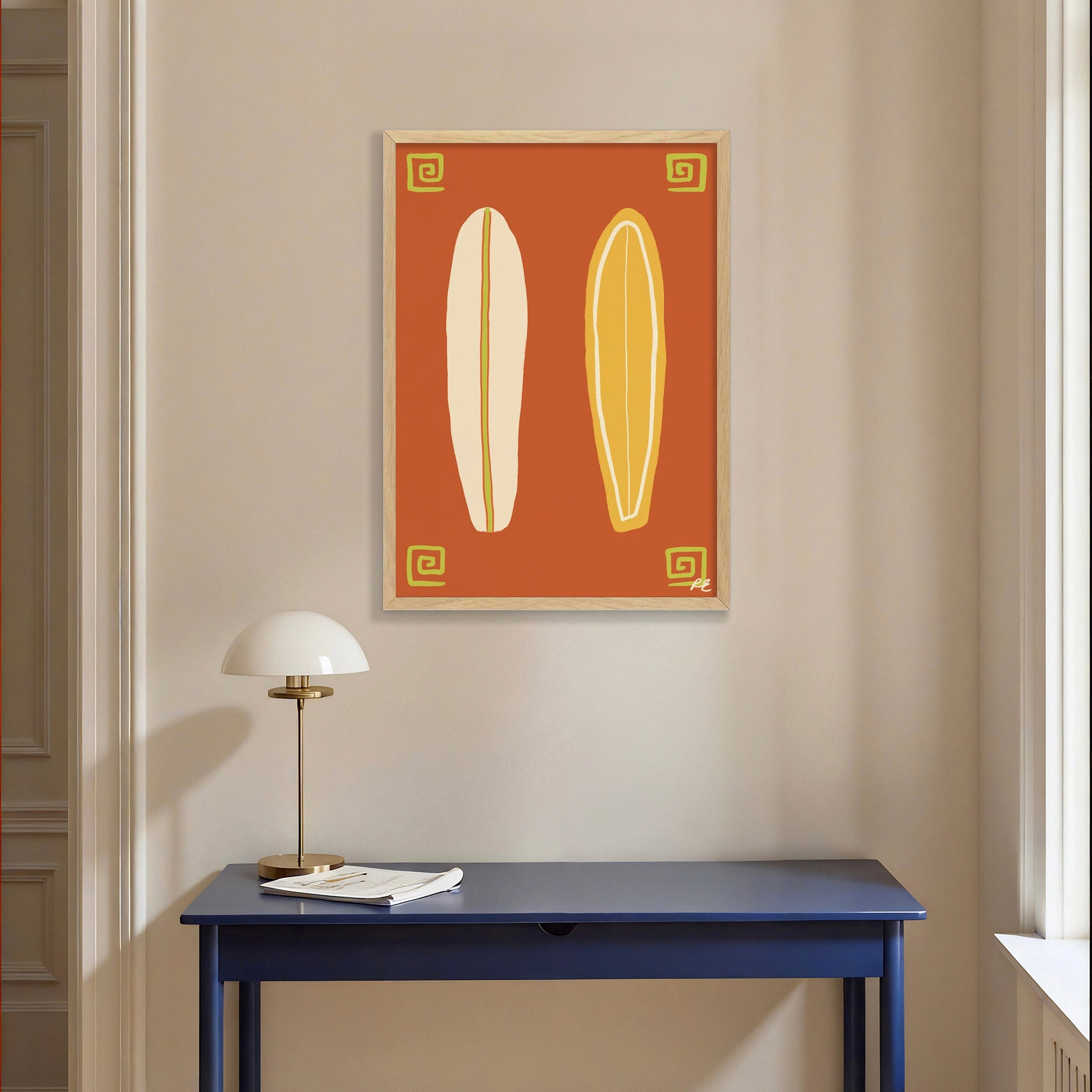 This fine art print by graphic designer Rosa Studio shows two longboards against a pastel background.