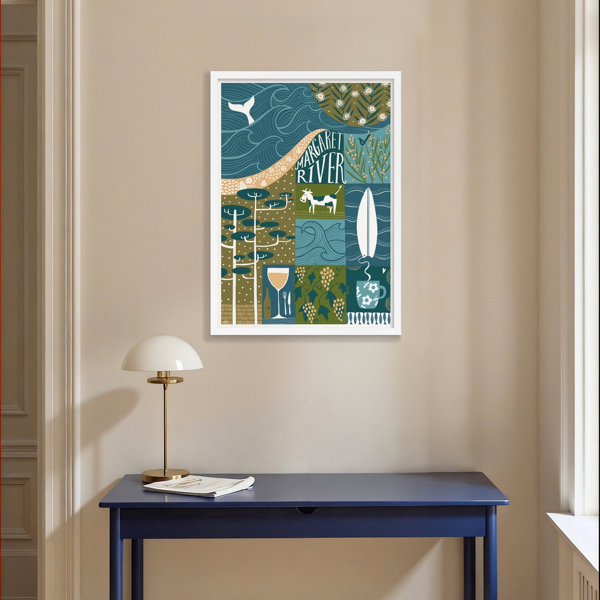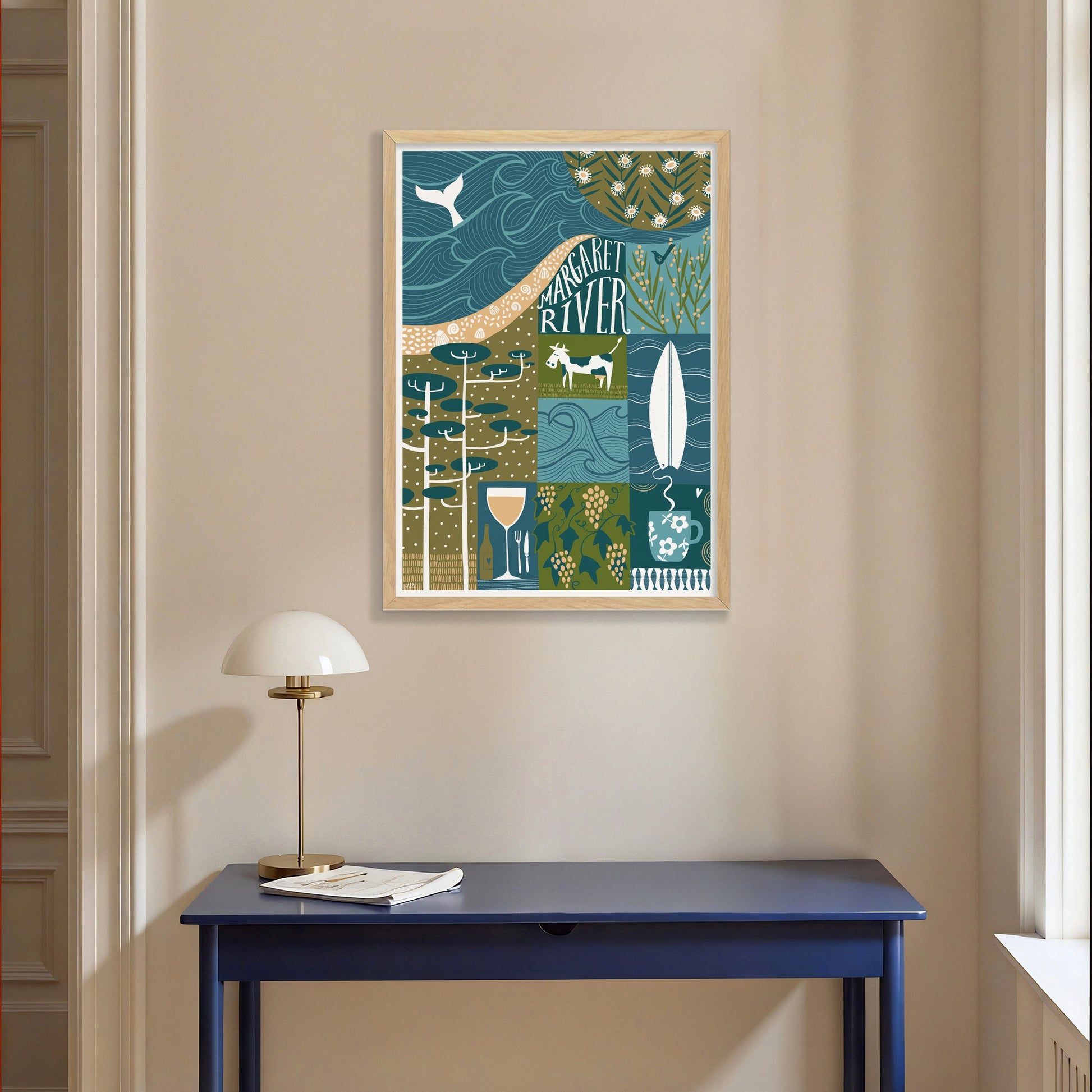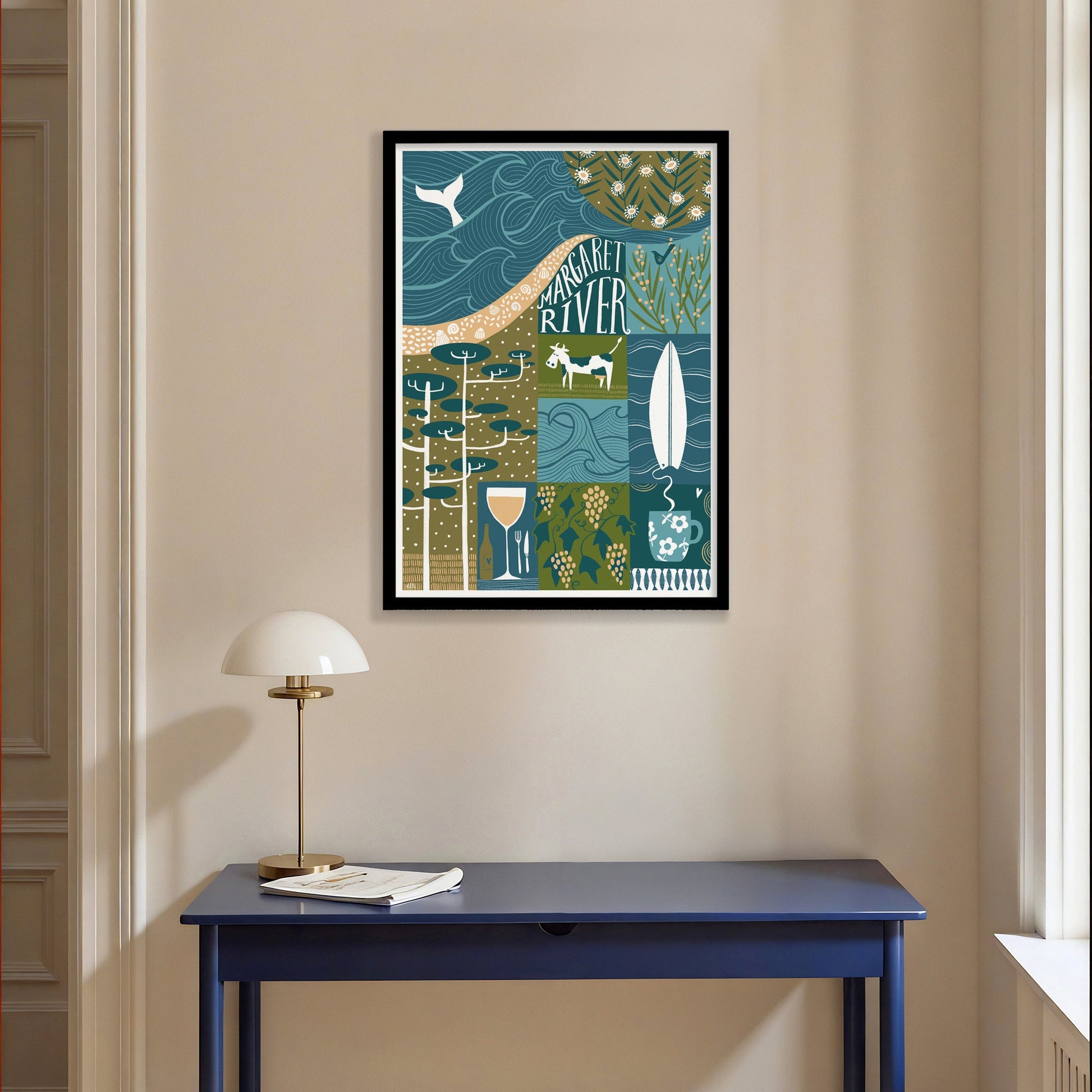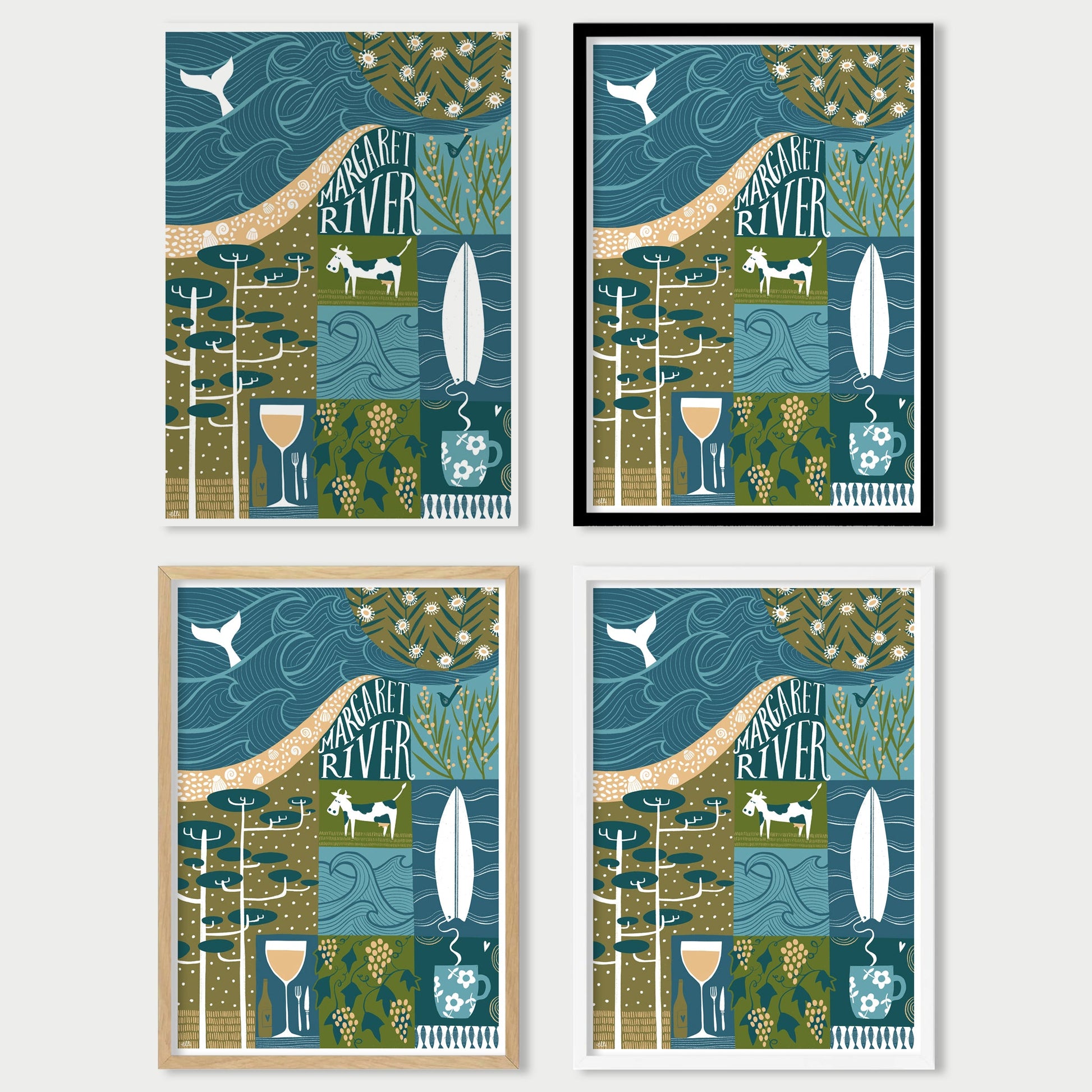 This fine art print by Elli Moody, celebrates the world-class wineries, lush forests, and stunning coastline found around Margaret River, a quiet town in the south west of Australia. This art poster captures the essence of this renowned region, celebrating its natural beauty and culinary excellence.