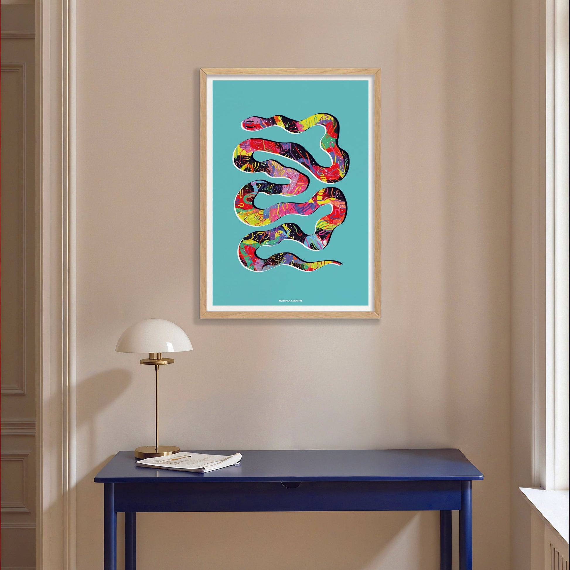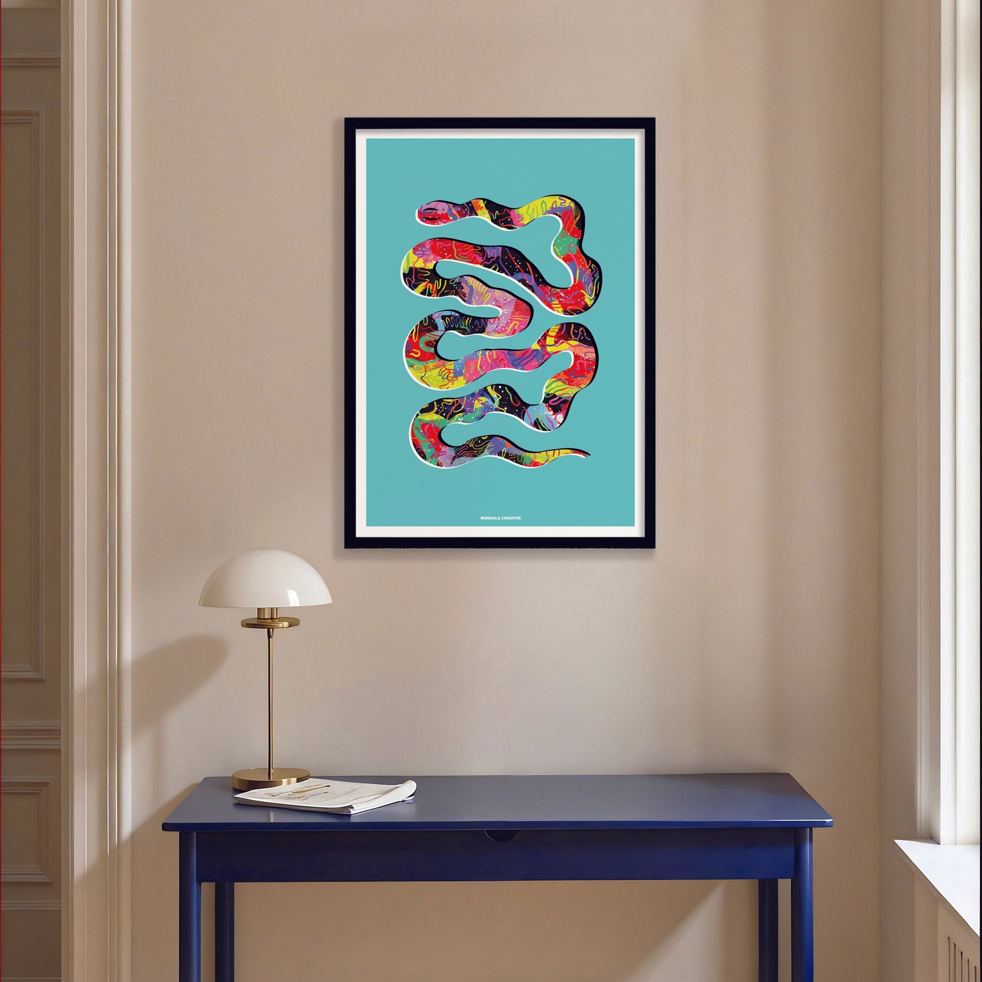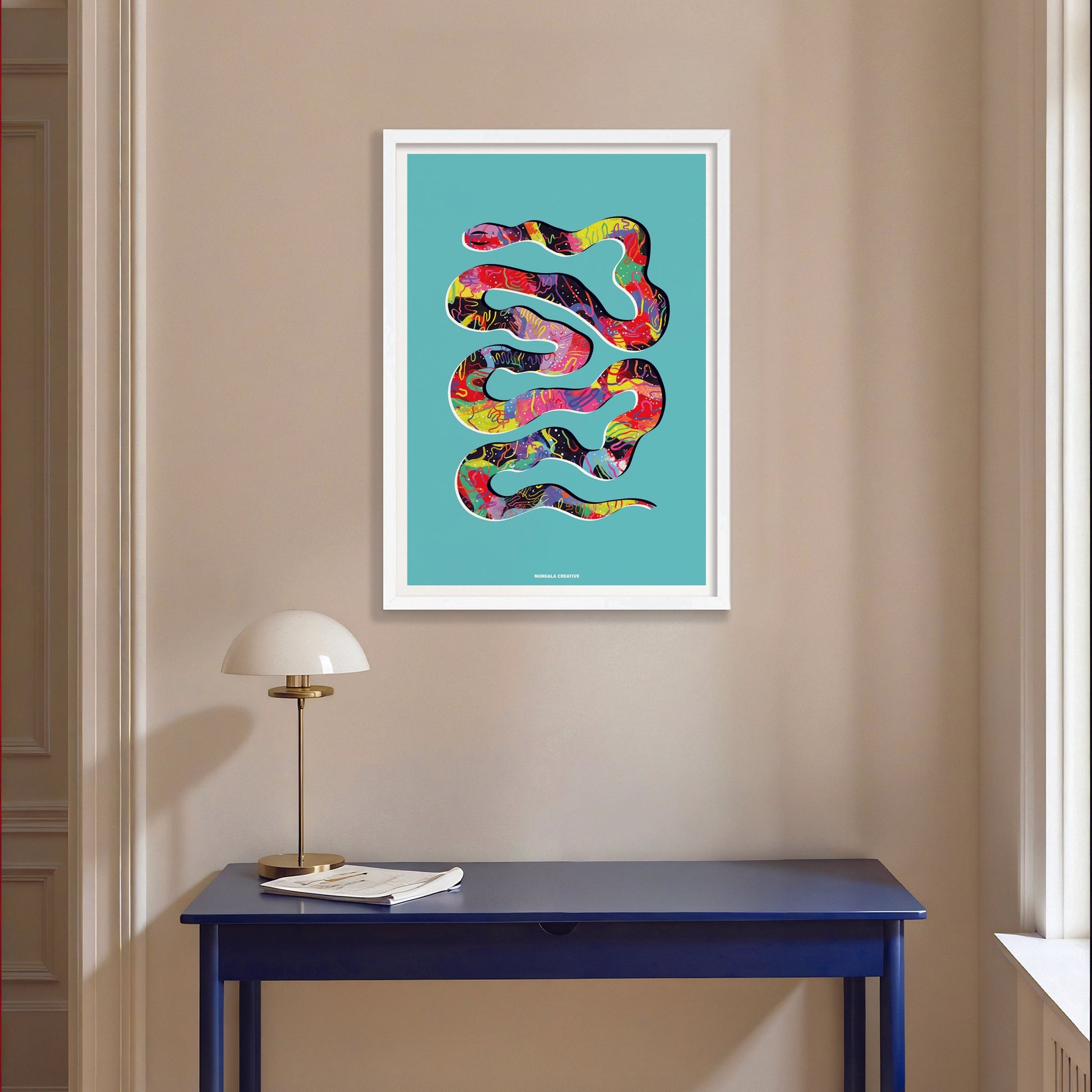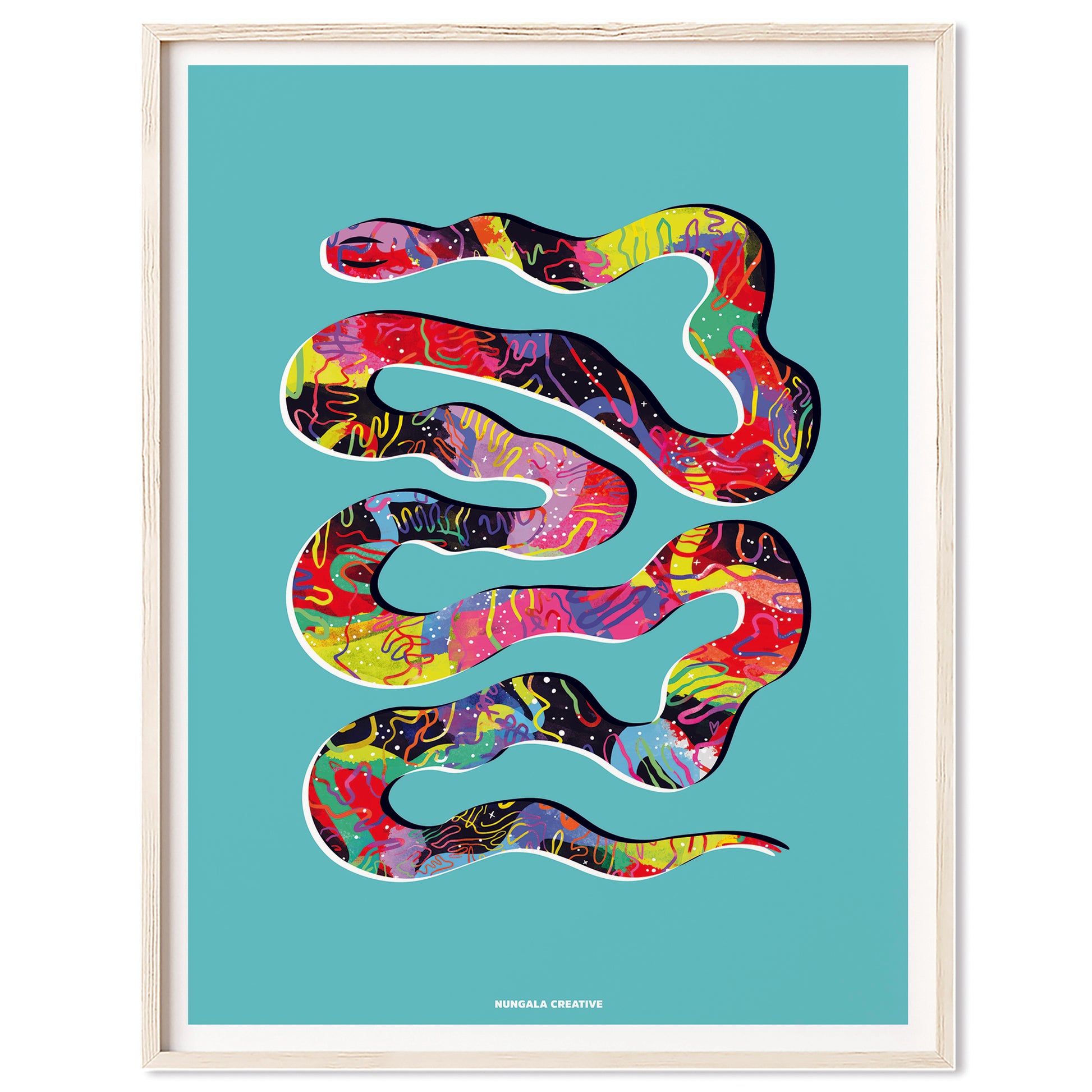 Fine art print created by Ngunnawal country (Canberra) artist Jessica Johnson celebrates the Rainbow Serpent, a powerful figure in Aboriginal Australian mythology, a creator deity associated with water, creation, and the landscape.