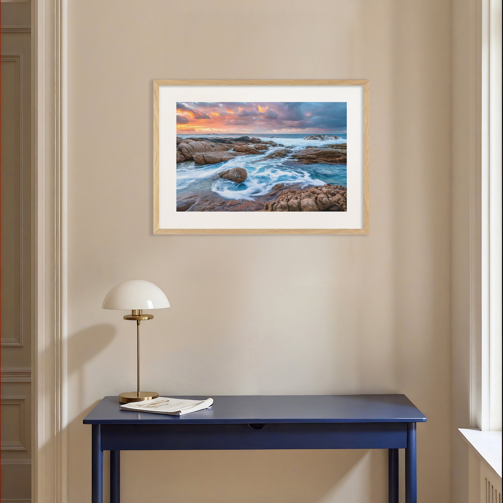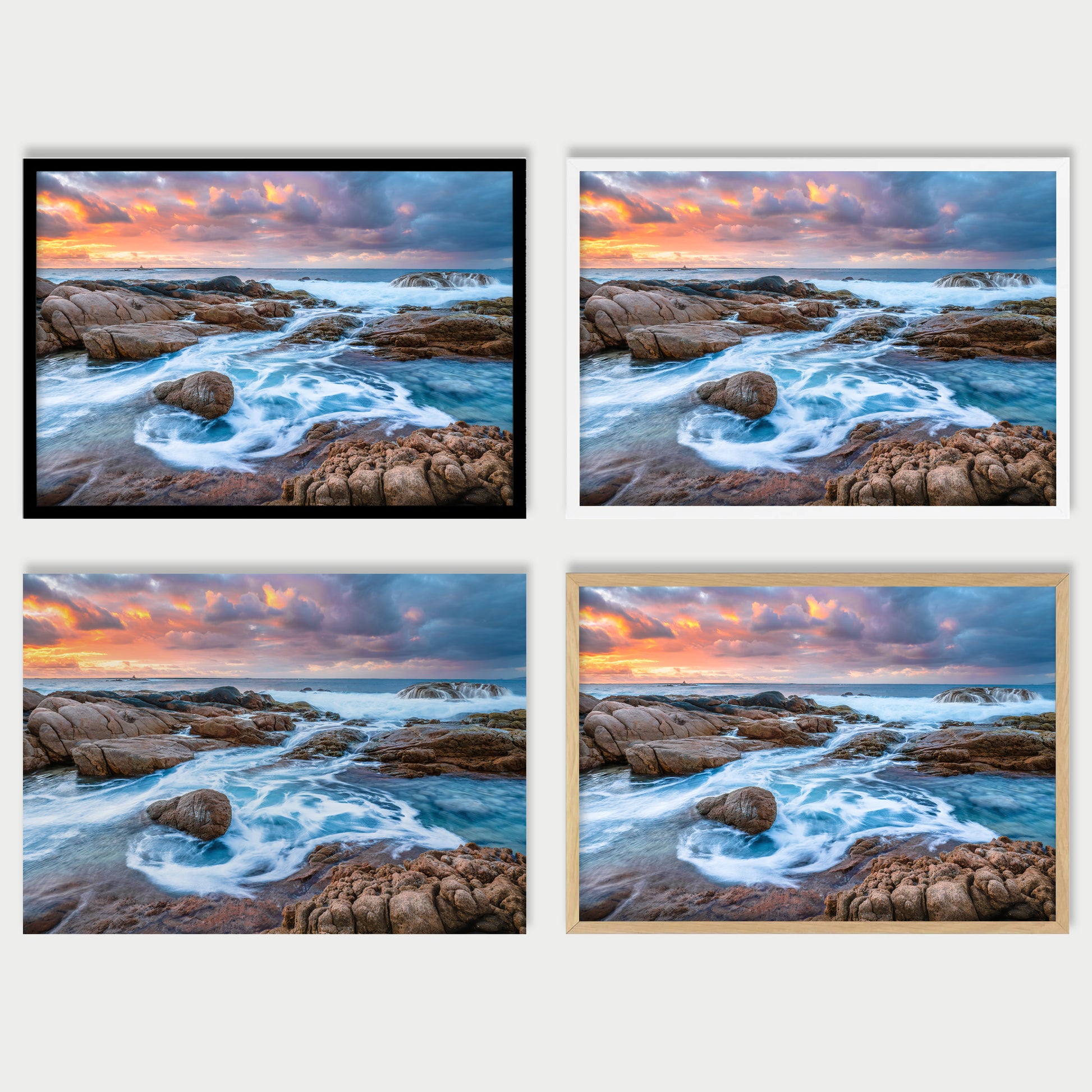 Handcrafted wooden frames available in Black, Natural Oak, or White.