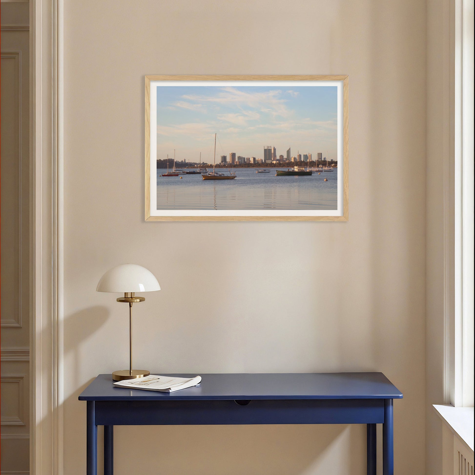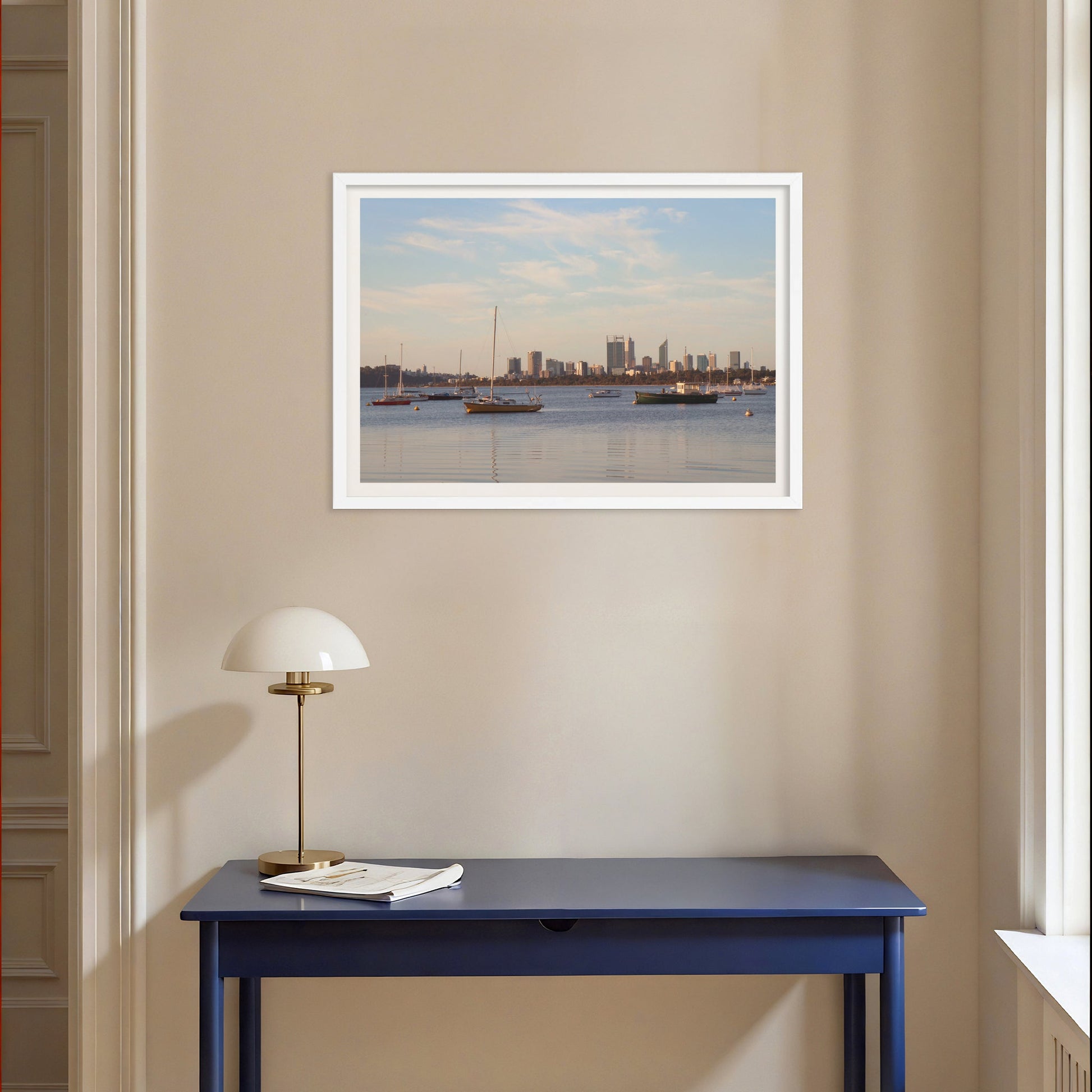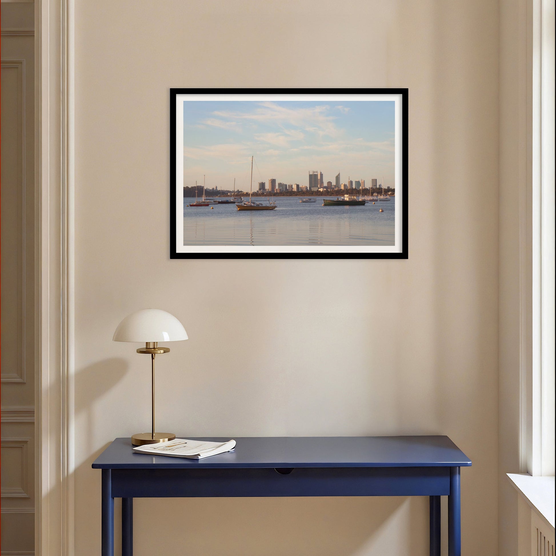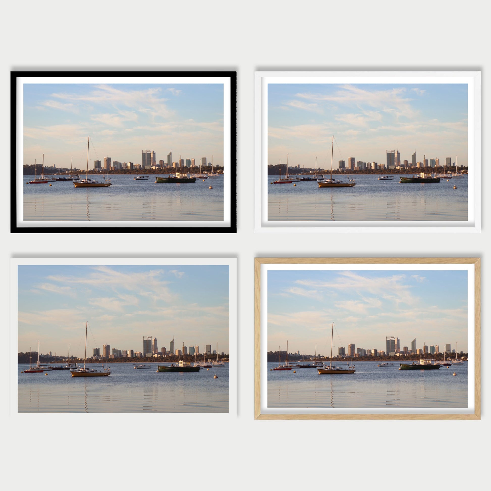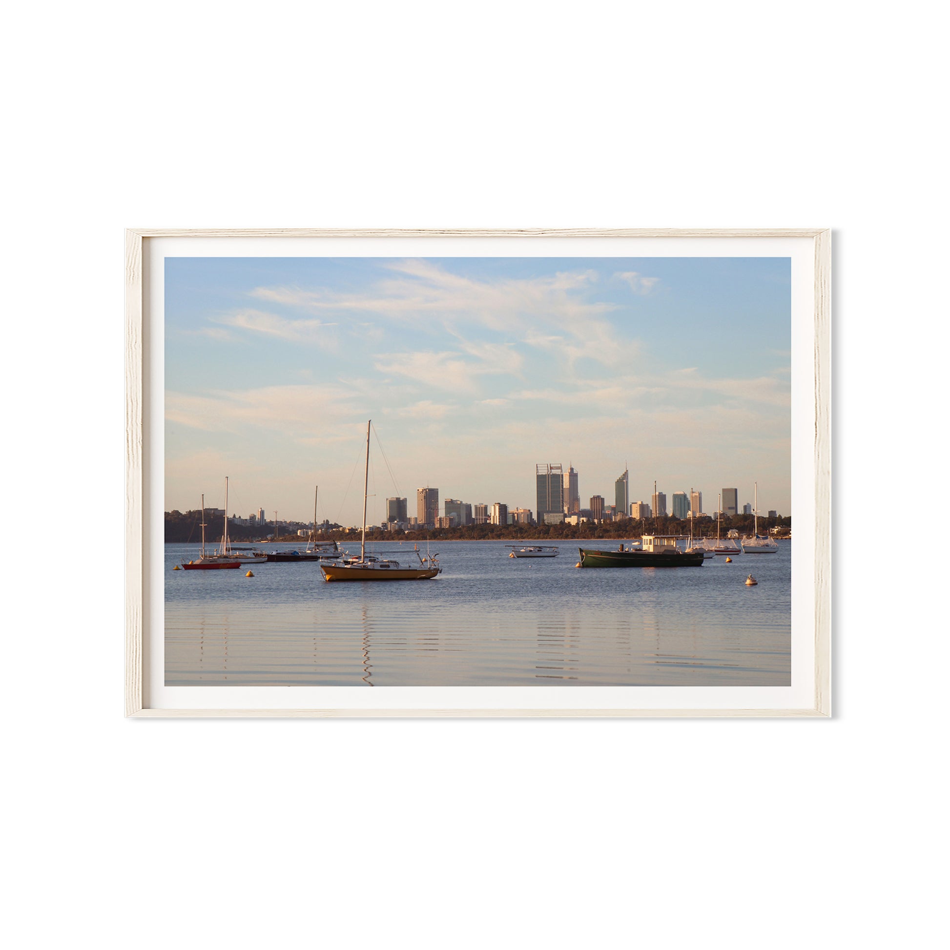 This fine art photography print by Australian photographer Joshua Kyle captures boats mooring on the still waters of the Swan River located in the centre of Perth, Western Australia.