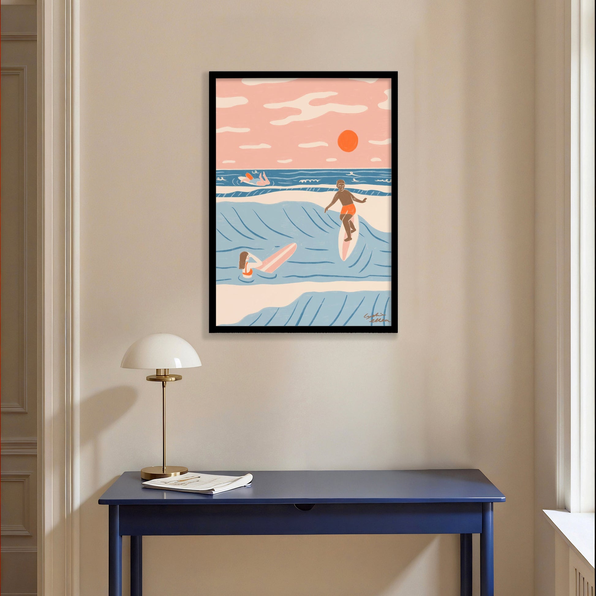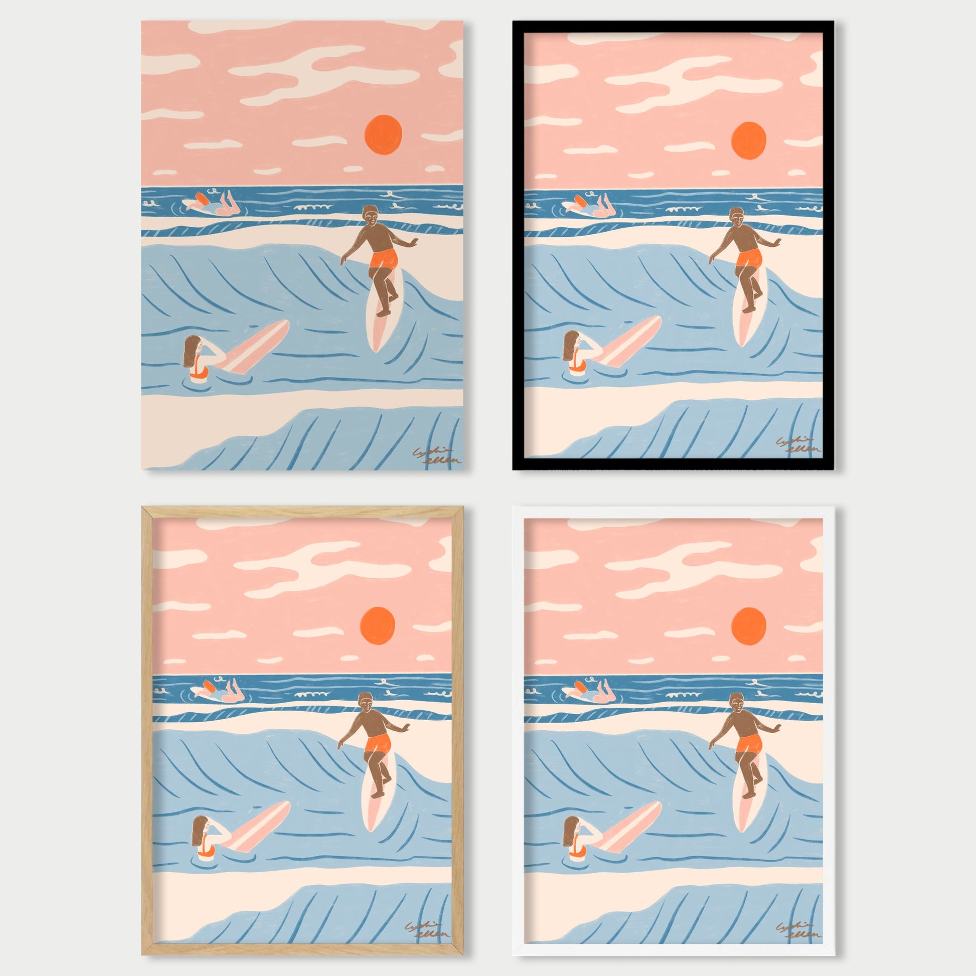 This fine art print by Lydia Ellen uses vibrant yet soft colours that bring joy and comfort to the viewer. This piece represents Australia's deep connection to the beach. As a vast island nation, Australia is surrounded by coastline, offering endless stretches of sand and water for the adventurous.