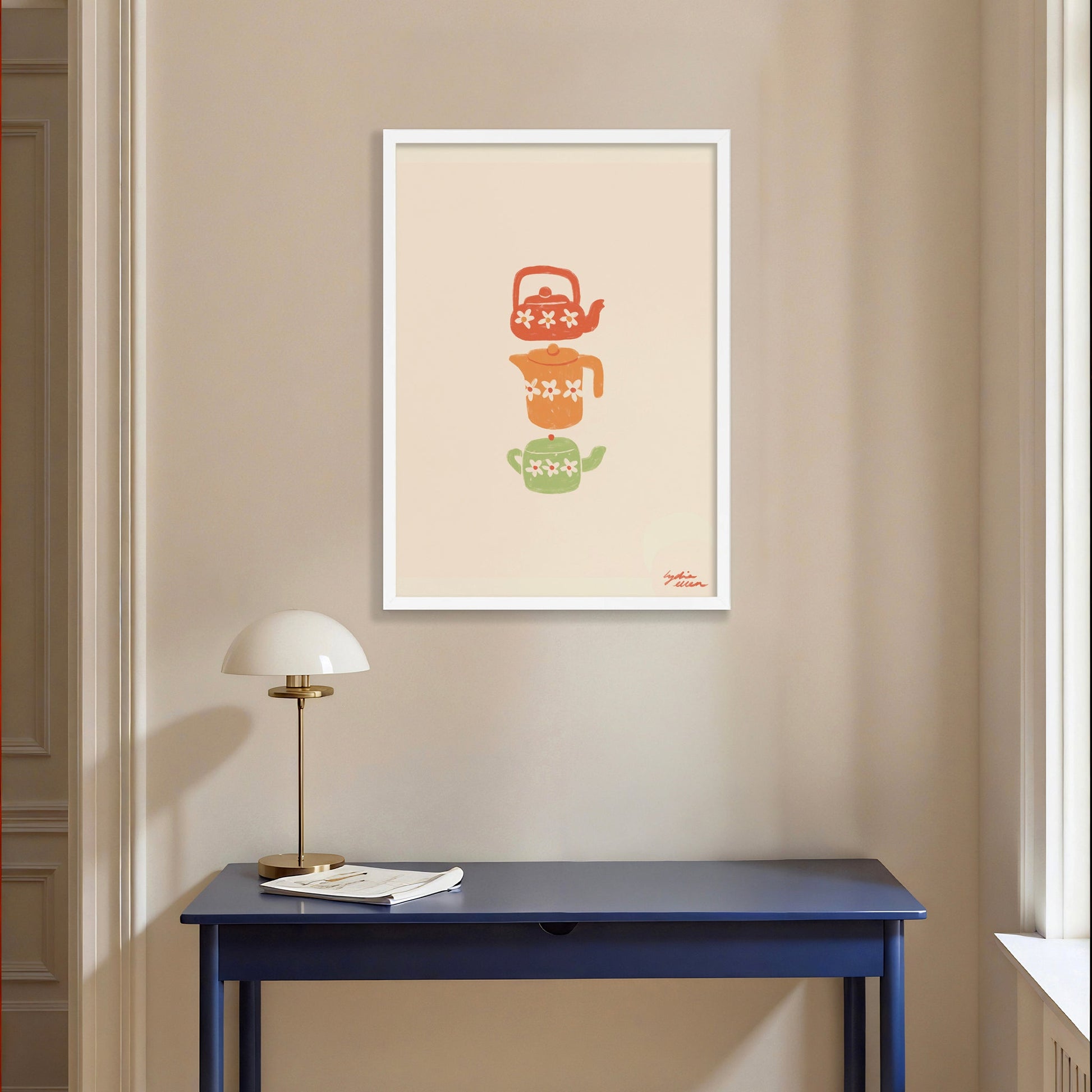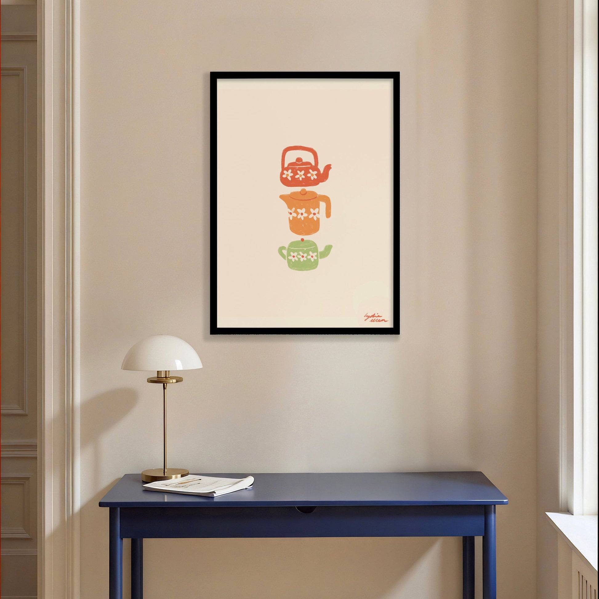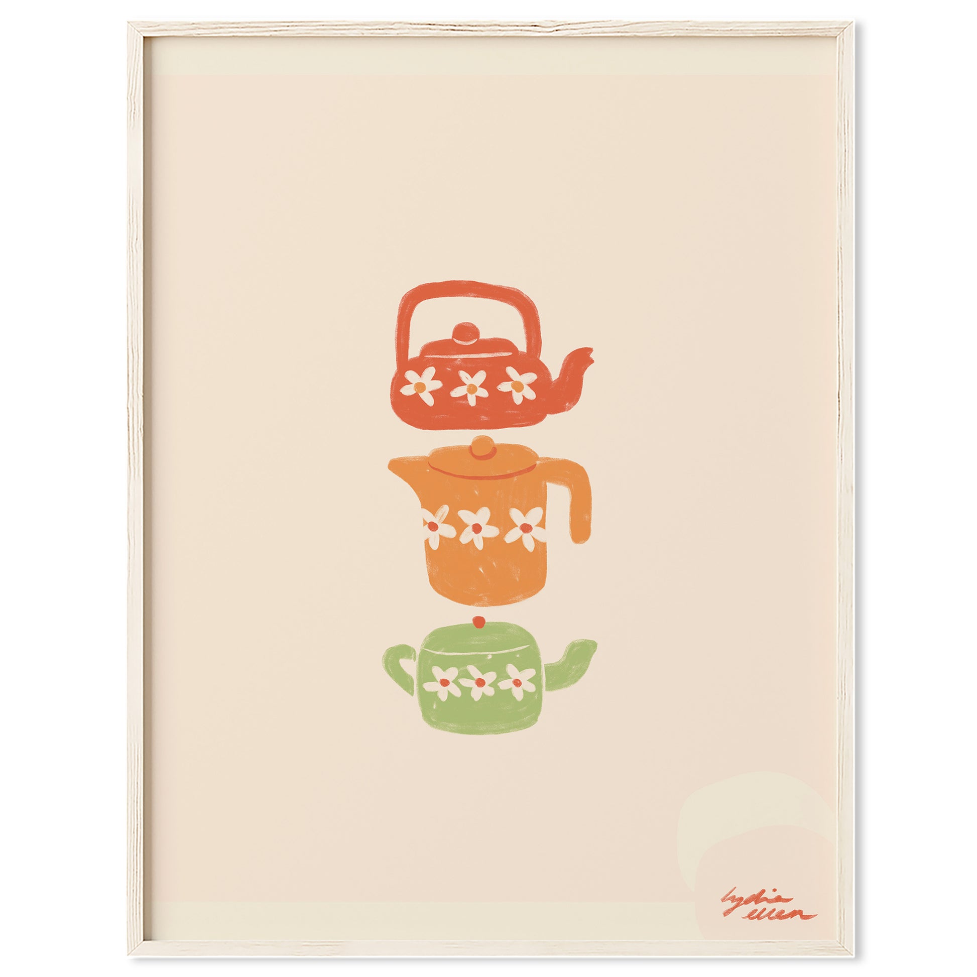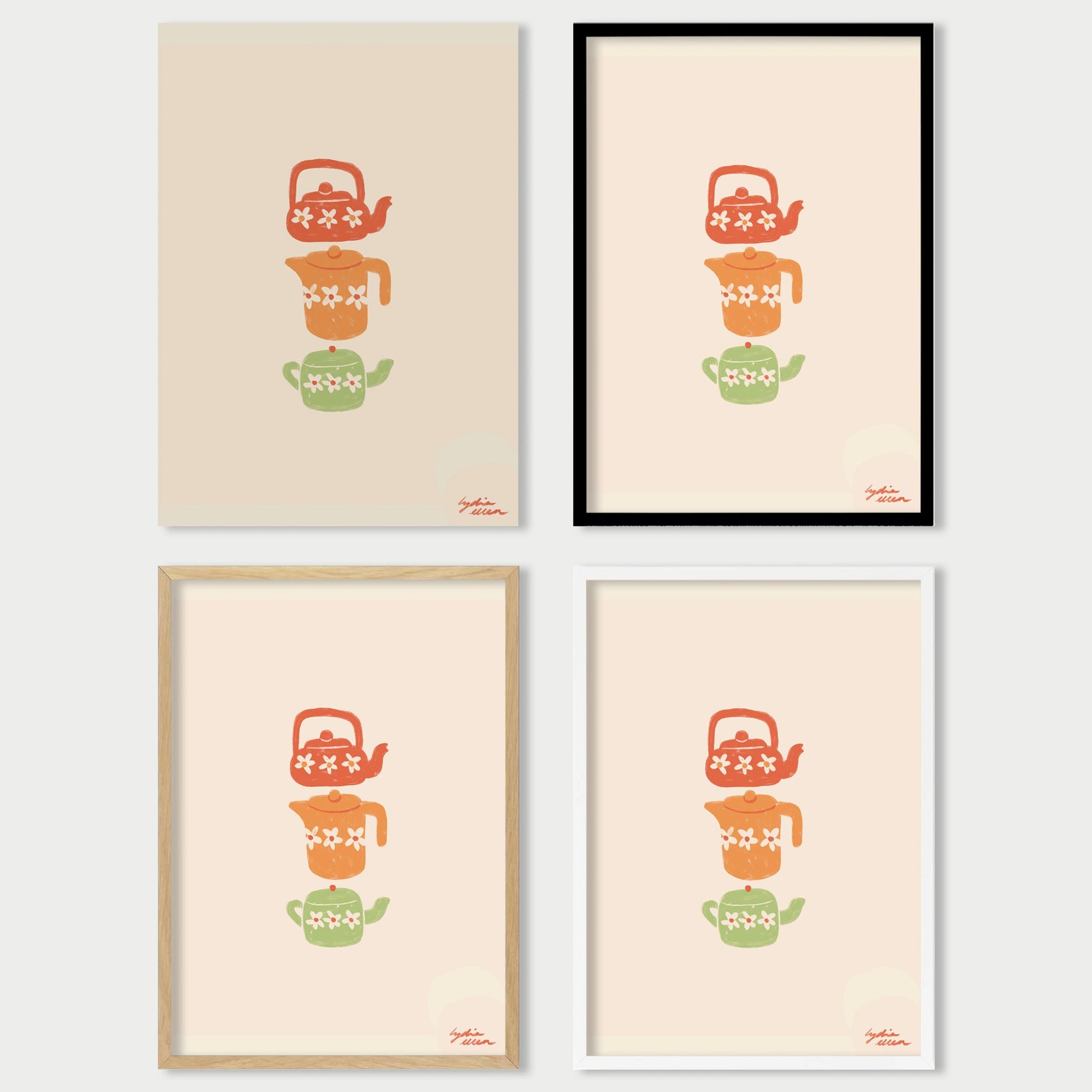 This art poster by Lydia Ellen playfully captures the charm of teapots, symbolizing the British influence in Australia and the cherished tradition of afternoon tea. This intricate drawing showcases a variety of teapots, each reflecting the timeless elegance and cultural significance of tea time.