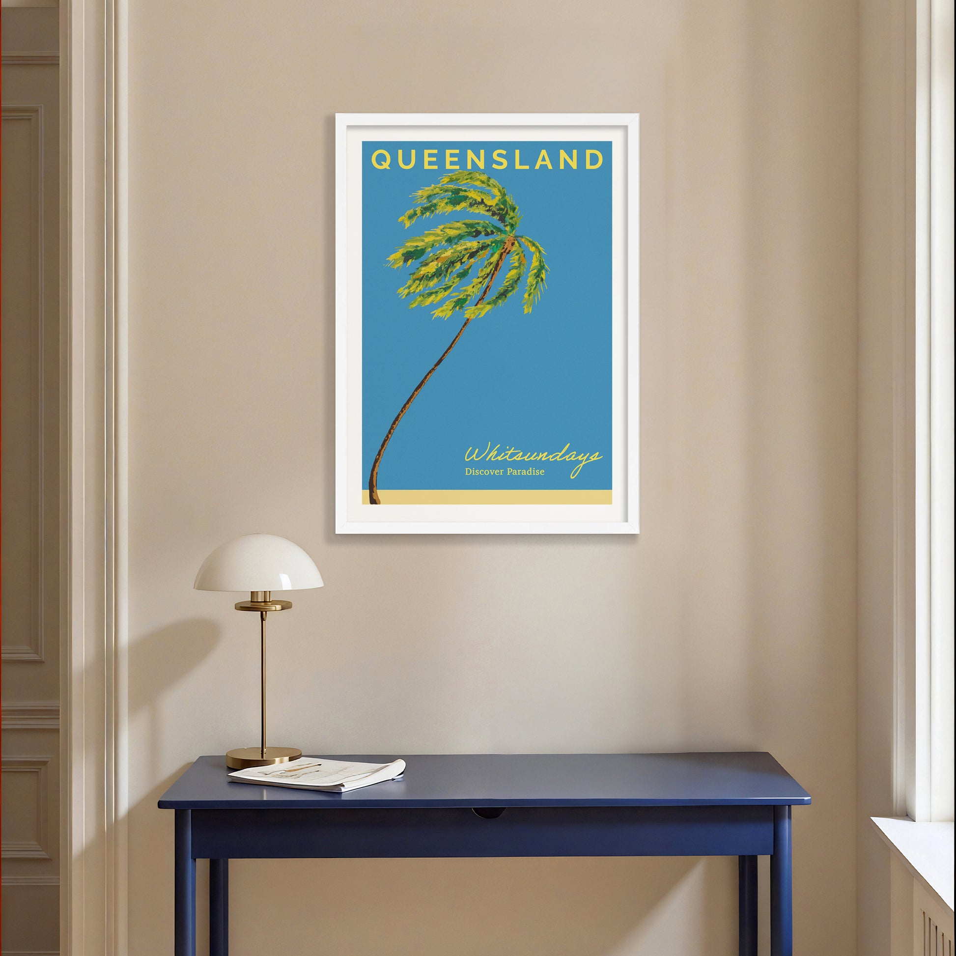Discover paradise with this vintage print of Whitsundays, Queensland. Made up of 74 islands just off the coast of Queensland, Whitsundays is a tropical paradise and an icon of Australia. This print adds the perfect touch of vintage beach style to your home.